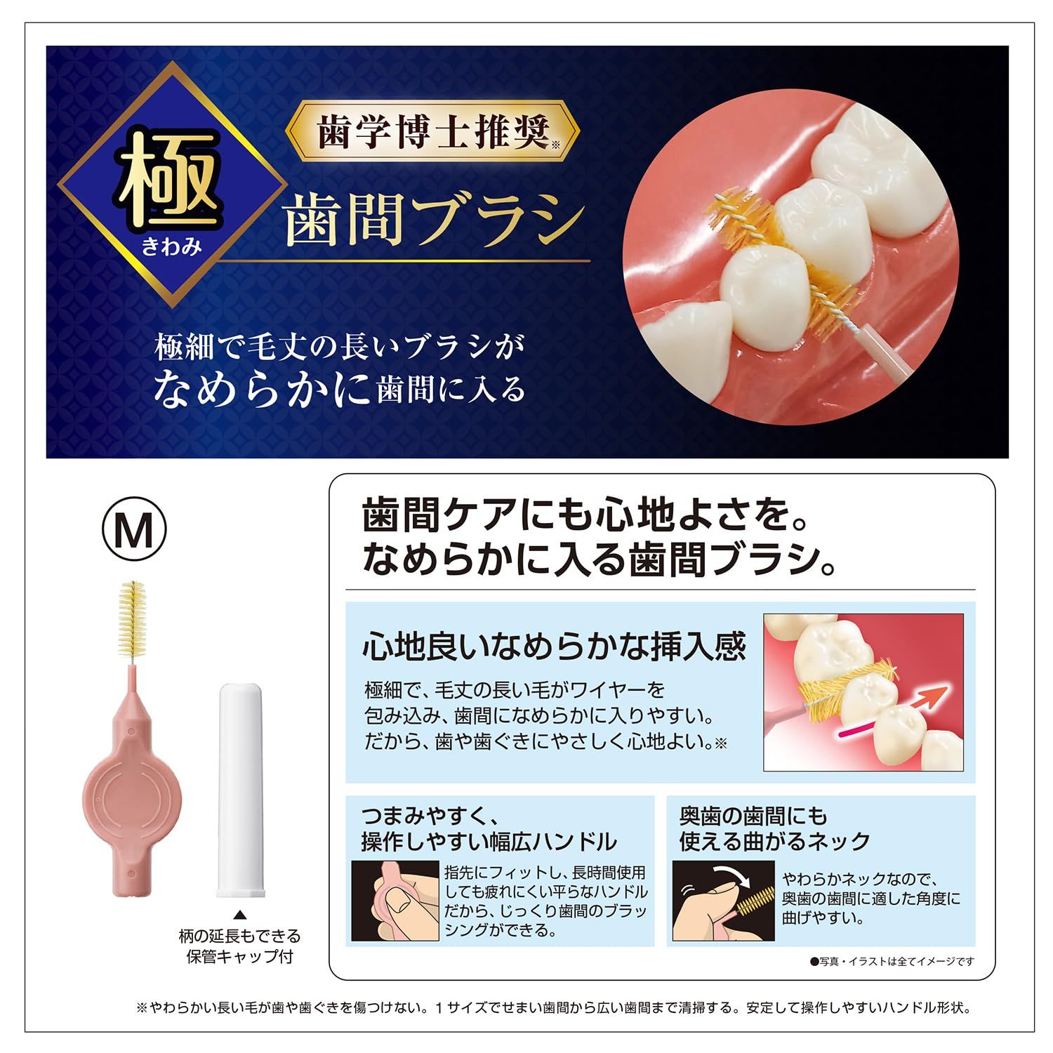 歯間ケアにも心地よさを追求した、「極歯間ブラシ」(I字型ワイヤー歯間ブラシ)。いつもの歯間ケアが至福の時間に。歯学博士が推奨するブラシ設計。 極細で毛丈の長い毛がワイヤーを包み込みながら歯間になめらかに入るので歯や歯ぐきにやさしい。また、狭い歯間から広い歯間を1サイズでしっかり清掃できる。 むし歯や口臭、歯周病(※歯周炎・歯肉炎の総称)の原因となる歯と歯の間の歯垢(プラーク)や食べカスを取り除き、磨き残しを防ぐ。 ネック部を曲げれば奥歯のすき間にも入りやすい。幅広ハンドルが軽くつまむだけで指先にフィットするので操作しやすく、長時間使用しても疲れにくい。 柄の延長もできる保管キャップ付。 歯ぐきの退縮が見られすきまが見える方に、ふつうMサイズ。