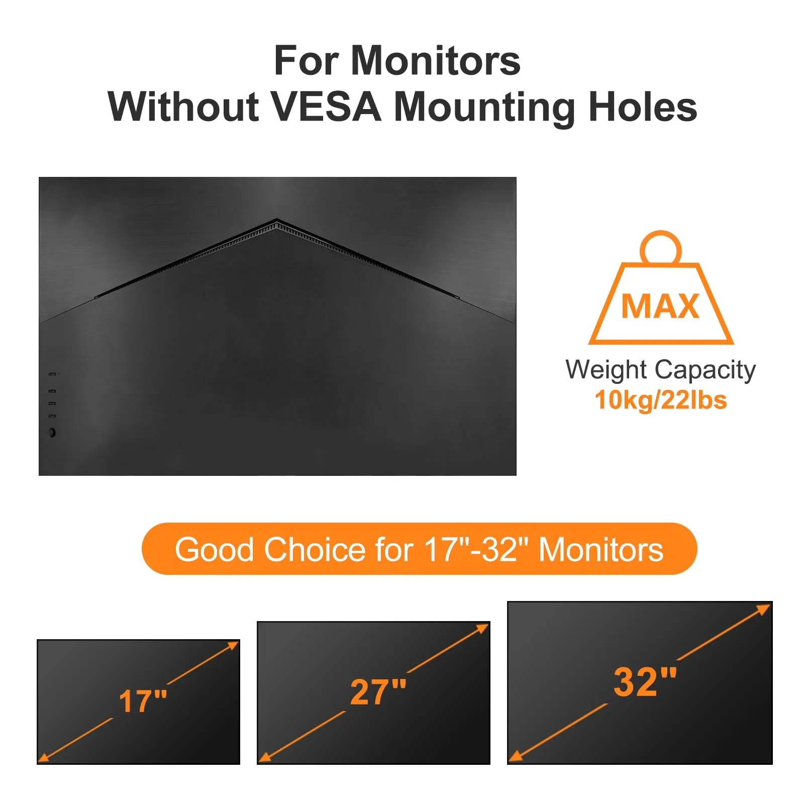 【商品仕様】VESA穴のないモニターを、モニターアームに取り付けられる、モニターマウントホルダーです。耐荷重:8kg対応サイズ:17~32インチ厚さ:25.4~76.2mmの厚さのほとんどのモニターをサポートします。
