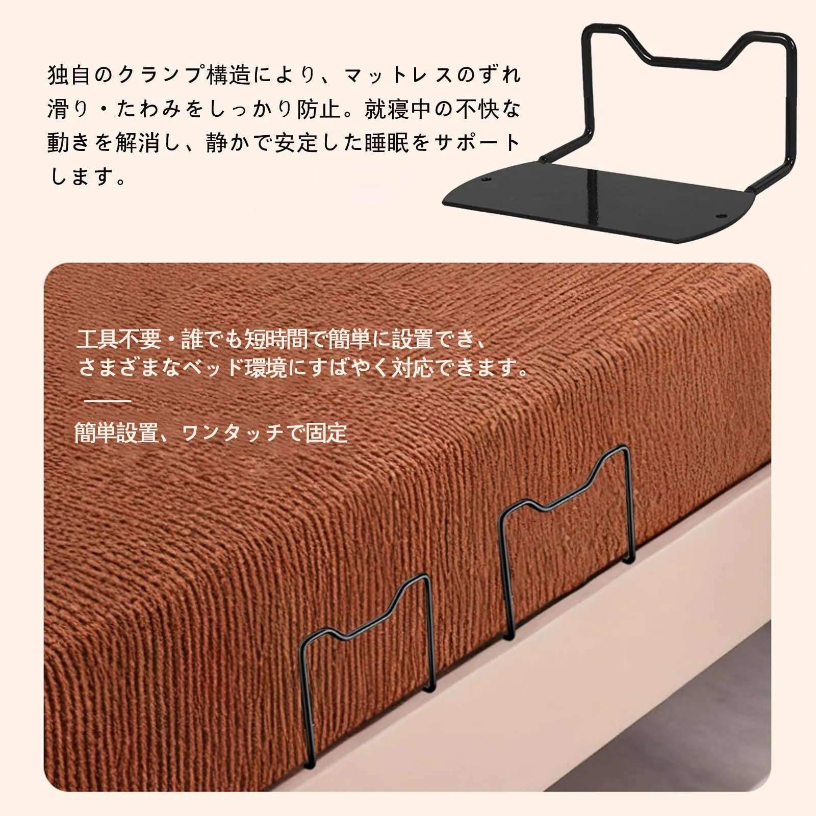 【確実なズレ防止】独自のクランプ構造により、マットレスのずれ・滑り・たわみをしっかり防止。就寝中の不快な動きを解消し、静かで安定した睡眠をサポートします。
