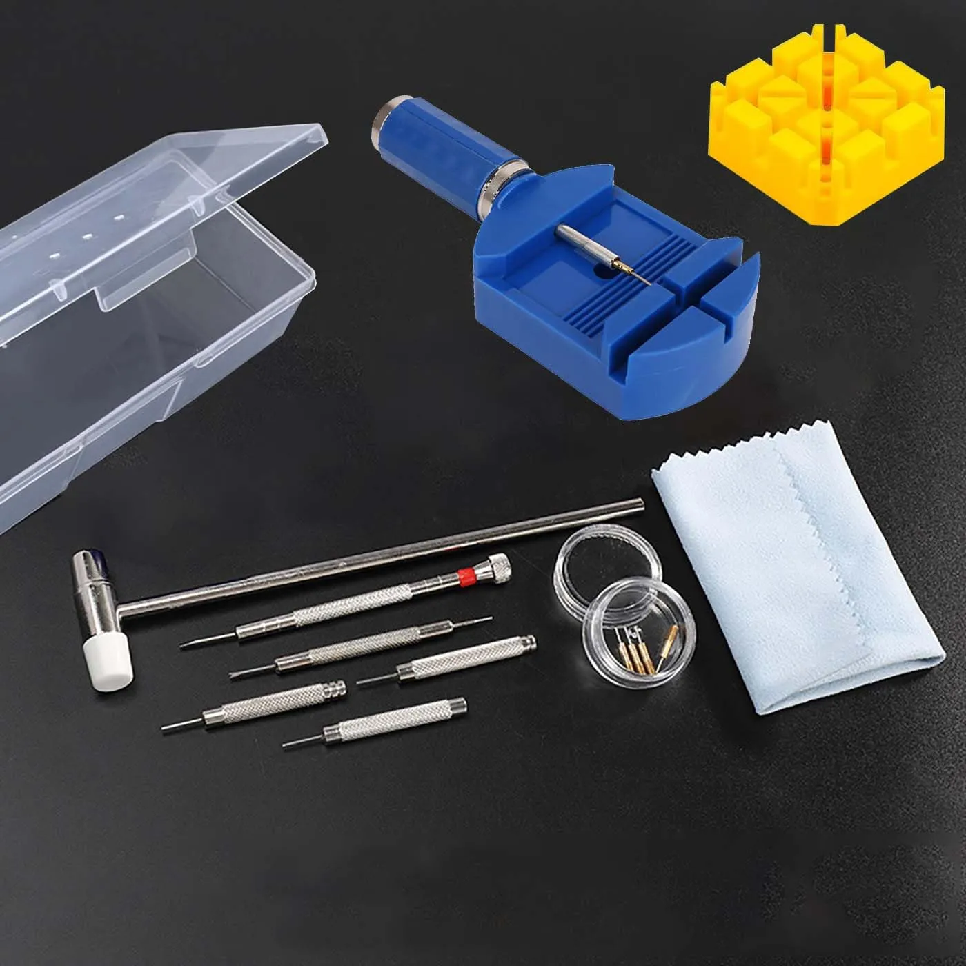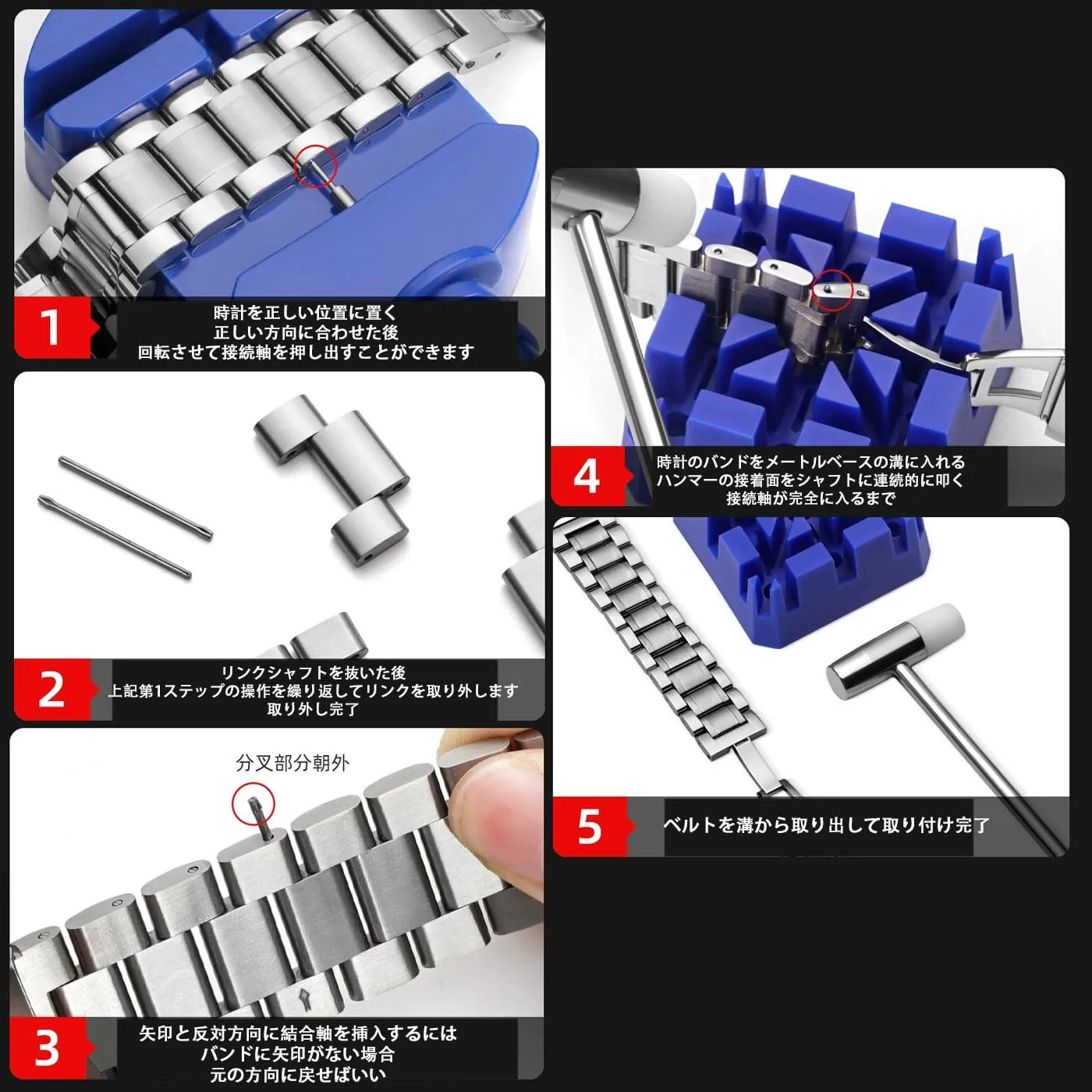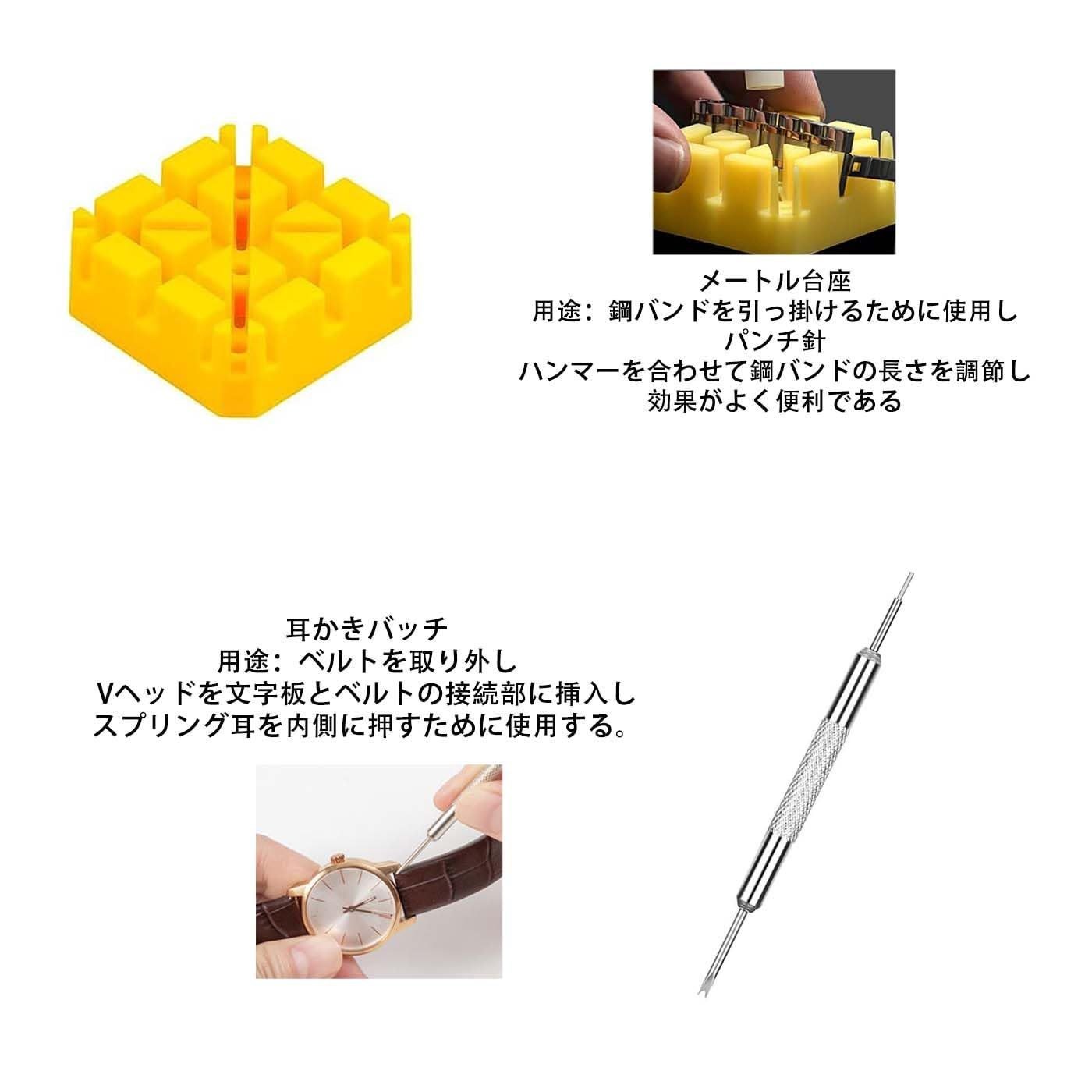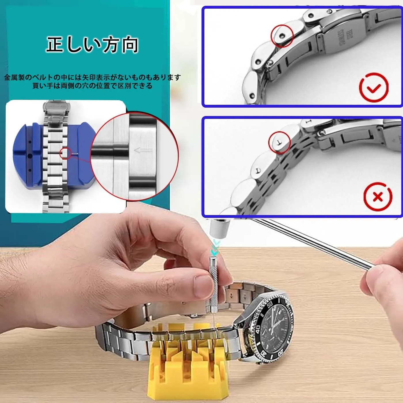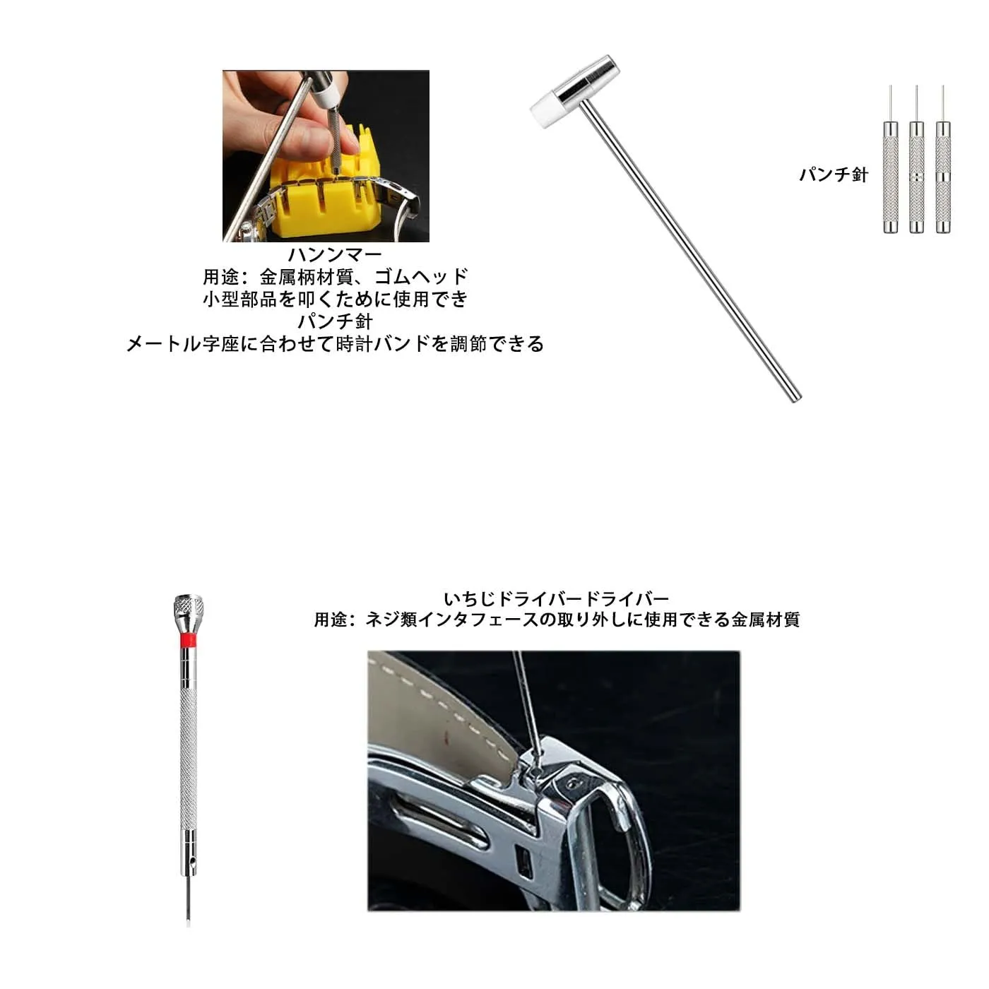 【包装内容】時計取り外し工具:時計ホルダー、小型ハンマー、小型ドライバー、穴あけパンチ、時計バンドリンクリムーバー、極細繊維クロス。
