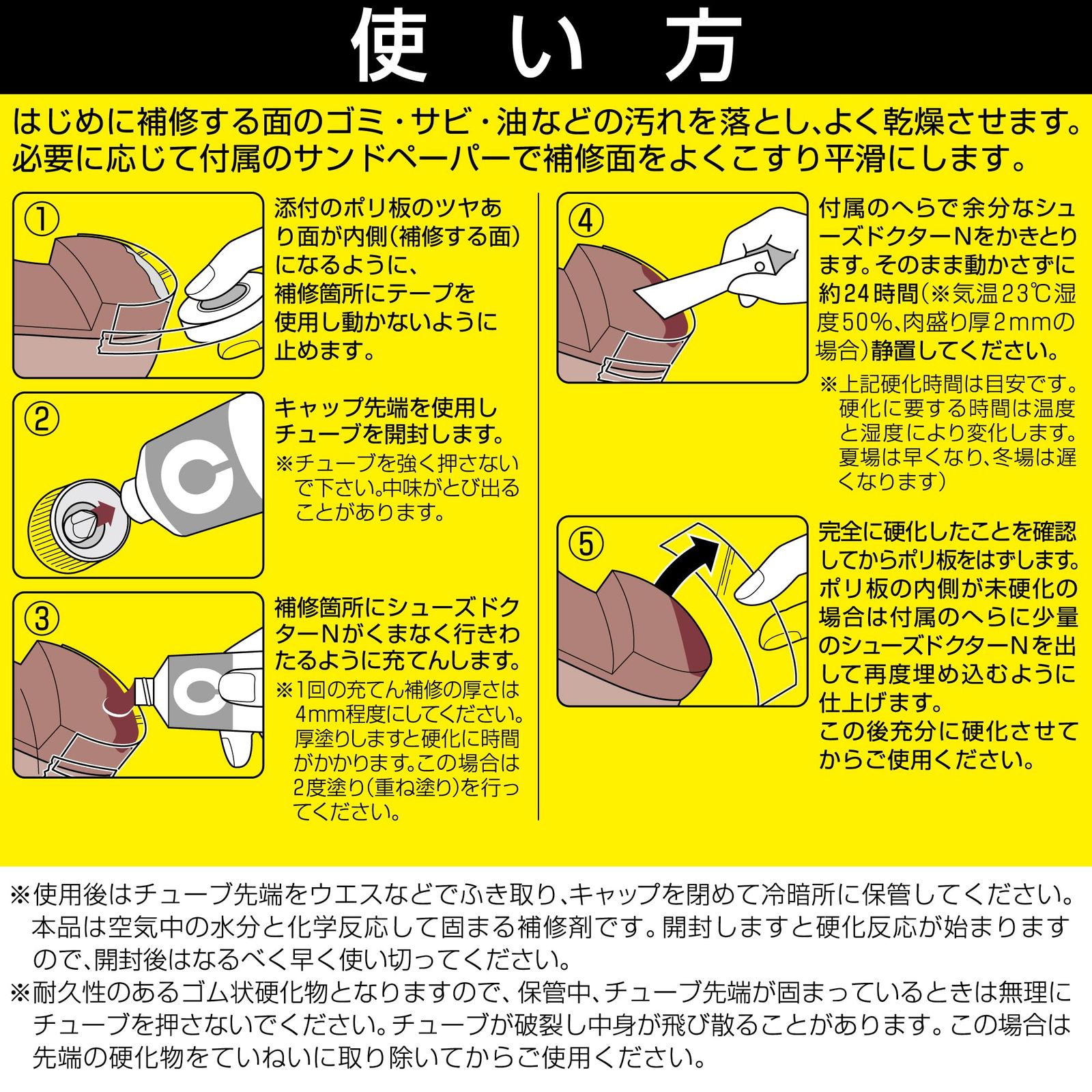 【特徴】 ・かかとのすり減りだけでなくはがれたときの接着剤としても使用できる ・シンナーを全く含まないので室内でも、いやなニオイがない ・硬化後は塗装ができ、微妙な色あわせも可能 内容量:50ml 色:ブラック 付属品:補修用ポリ板・ヘラ・サンドペーパー 仕様:環境対策商品 成分:ウレタン樹脂 最後までご確認頂き誠にありがとうございました。 上記をご確認頂き、ご購入いただけましたら幸いです。 何かご不明な点がございましたらお気軽にメッセージからお問い合わせ下さい。
