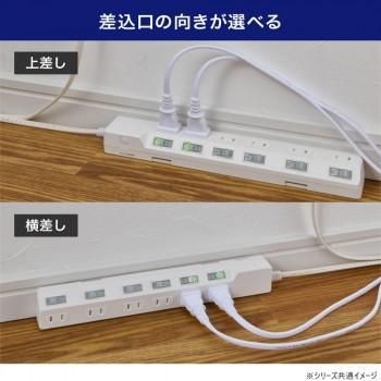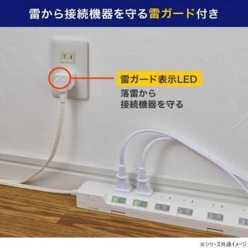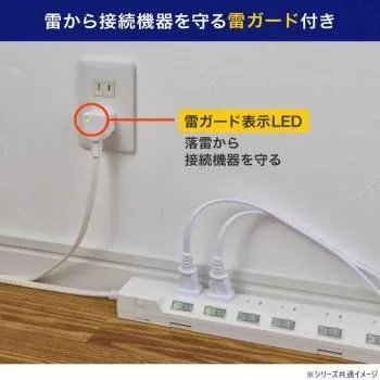 LEDランプ仕様。独立スイッチ。雷から接続機器を守る耐雷サージ付。プラグに雷ガード表示LED付。AC差込口はホコリ・ゴミの侵入を防ぐ扉付。熱や衝撃に強いPBT樹脂採用。コードは、断線に強い保護被ふく。ACアダプター用差込口。本体の向きによって、差込口向きが選べる。