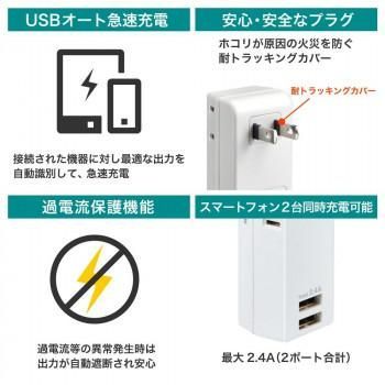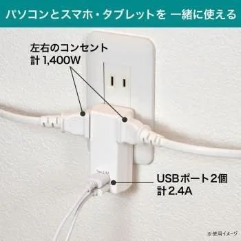 ■ラッピング(包装)対応不可です。 iPhone、iPad、Androidスマートフォン/タブレットを充電可能です。接続された機器(iPhone、iPad、Android等)に対し、最適な出力を自動識別し、急速充電する自動識別機能。過電流保護機能で過電流等の異常発生時は出力が自動遮断され、安心です。耐トラッキングカバーでトラッキング火災を予防します。 サイズ個装サイズ:7×5×16cm 重量個装重量:83g 仕様AC差込口定格:AC100V 14A 使用温度範囲:-10度~40度 口数:2個口 AC差込口合計1400Wまで 屋内専用 固定プラグ