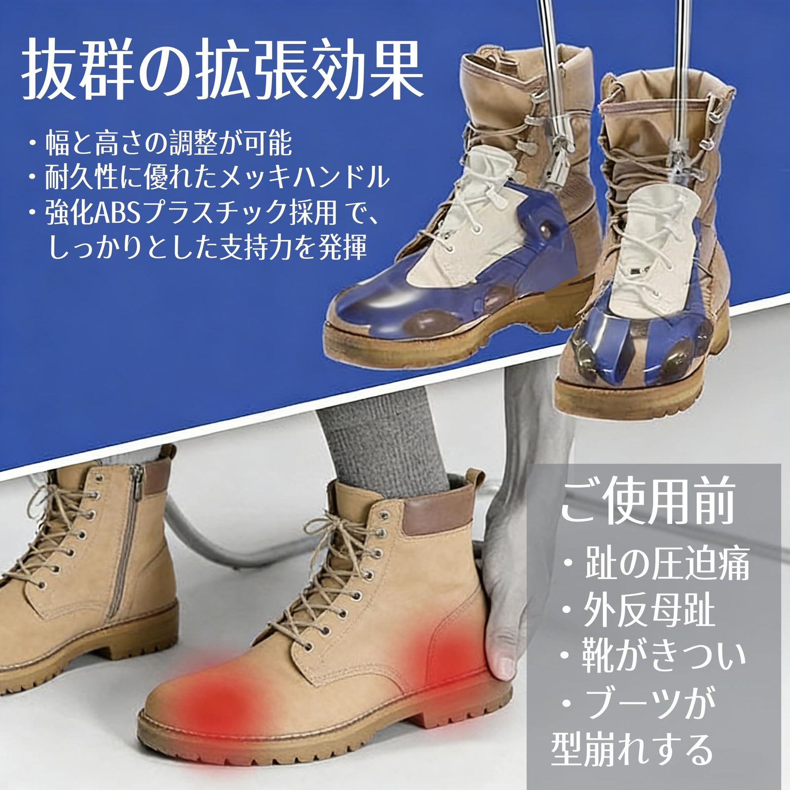 【ブーツ専用設計】つま先が圧迫される、窮屈で履くのが苦痛…このシューズストレッチャーがあれば、といったお悩みもこれで解決。専用設計のブーツストレッチャーがつま先を優しく広げ、お気に入りのブーツや新しい靴が驚くほど履きやすく。もうサイズが合わないからと諦める必要はありません。