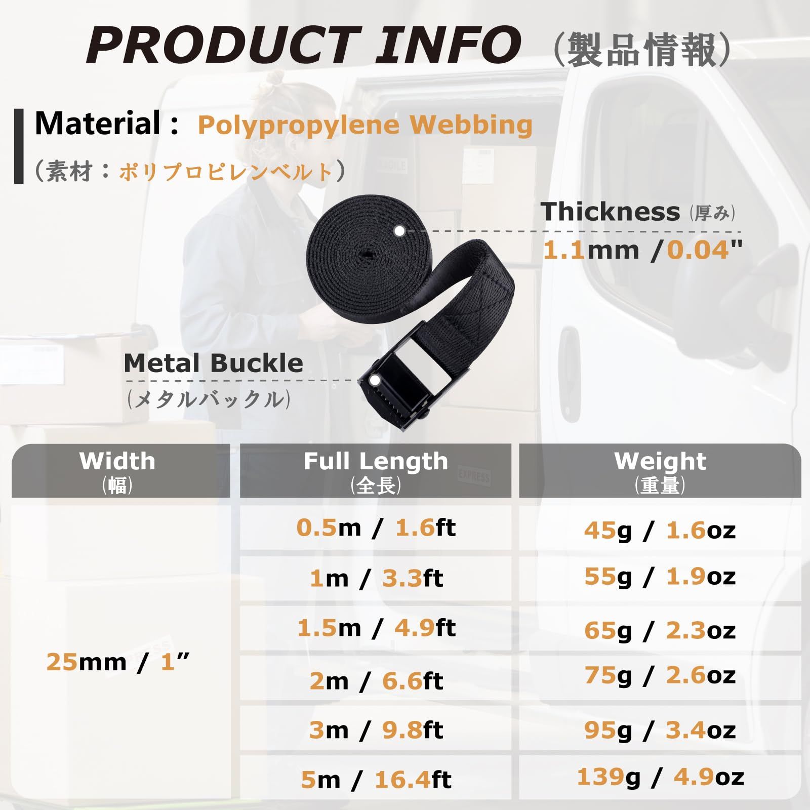 【破断強度】破断強度200kg。ベルト幅25mm;長さ0.5m、1m、1.5m、2m、3m、5mです