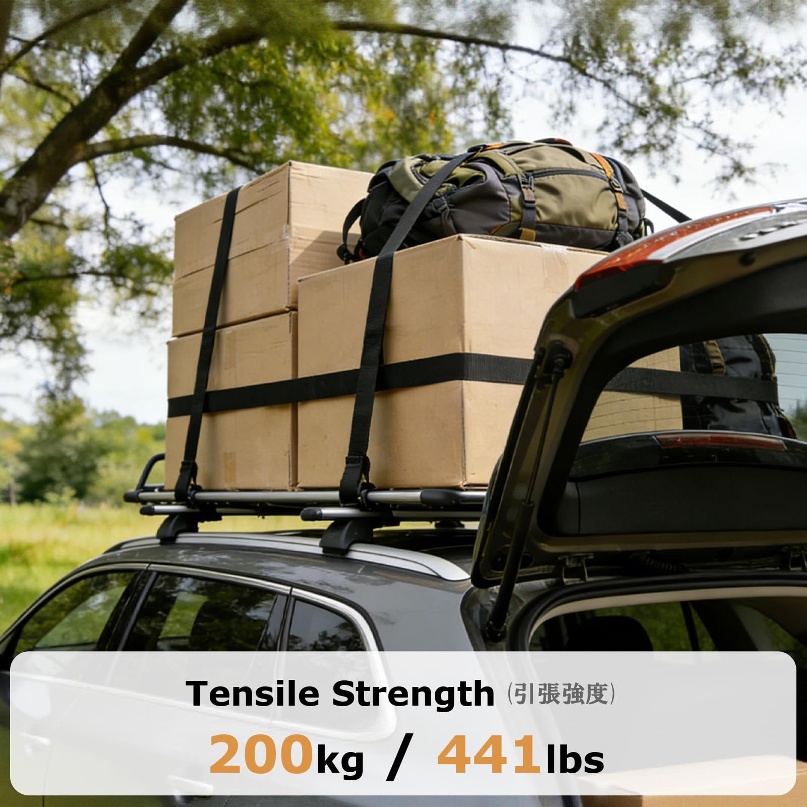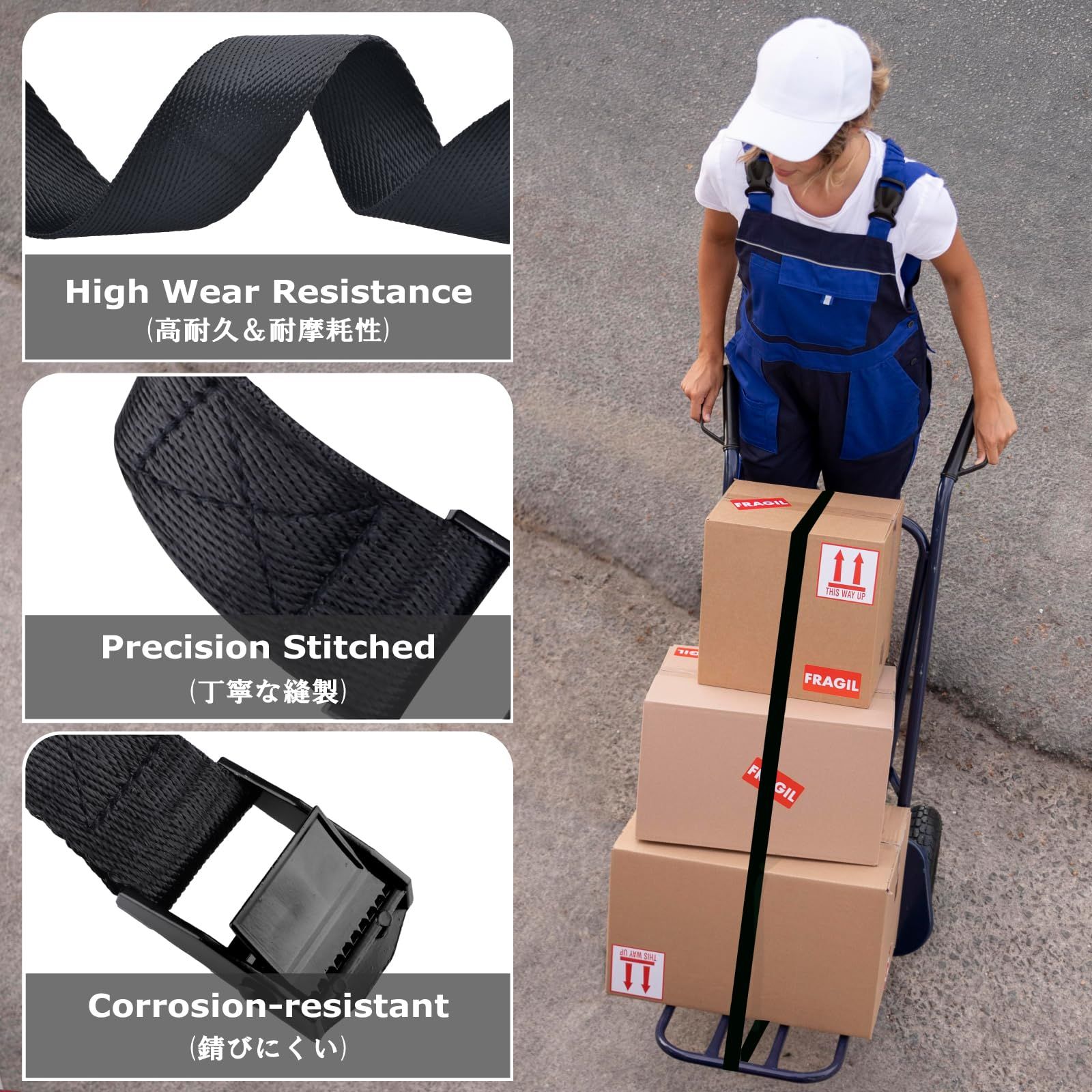 【製品材質】荷締めベルトはポリプロピレン生地を使っていて、耐摩耗性が優れています。メッキ加工した亜鉛合金のバックルは頑丈で耐久です