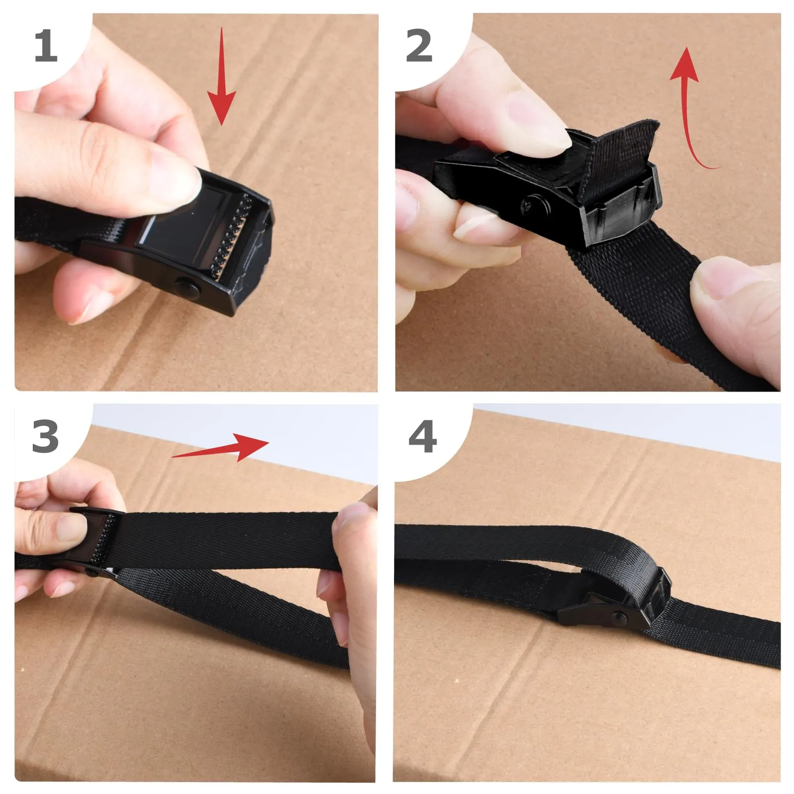 【使用簡単】荷崩れ防止の固定ベルトはカムバックル式のロック、ベルトをバックルの下から通して引っ張るだけで固定できます、使いやすいです