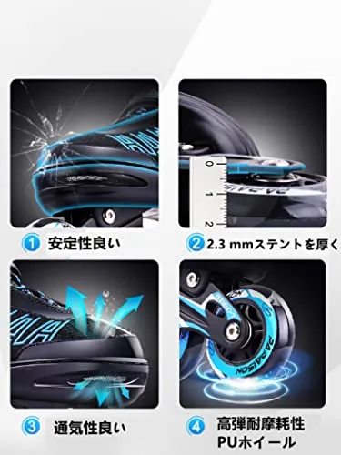 【発光&静音&安定】走ると8つのウィールがキラキラ光って、子供が大好きなかわいデザイン。インラインスケートの表面高強度衝突の対策を講じ、衝撃吸収材を使用し、振動を防ぐ 、安定感があります。安全性と快適さを確保します。一列四つのスケートの構造で、インラインスケートを順調に回ると同時に静音性も優れ、摩擦抗性が少なく、頑丈で耐久性に優れ、長時間使用しても大丈夫です。