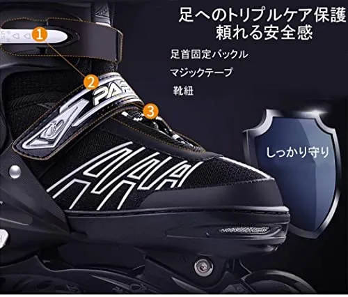 【サイズ調整可能なインラインスケート】サイズ:S(27-32):内寸 16-20cm、M(33-36):内寸 20.5-23cm、L(37-40):内寸 23-26cm、XL(41-44):内寸 26.5-29cm。 工具不要で、PUSHボタンで4段階サイズに変更できます、簡単に調整可能なので成長期のお子様に最適しています!