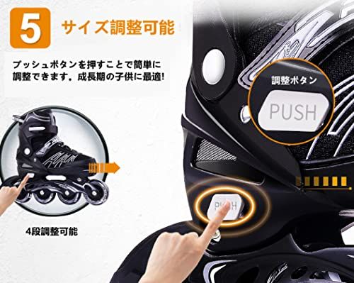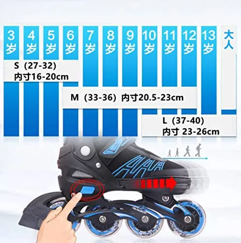 【サイズ調整可能なインラインスケート】サイズ:S(27-32):内寸 16-20cm、M(33-36):内寸 20.5-23cm、L(37-40):内寸 23-26cm、XL(41-44):内寸 26.5-29cm。 工具不要で、PUSHボタンで4段階サイズに変更できます、簡単に調整可能なので成長期のお子様に最適しています!