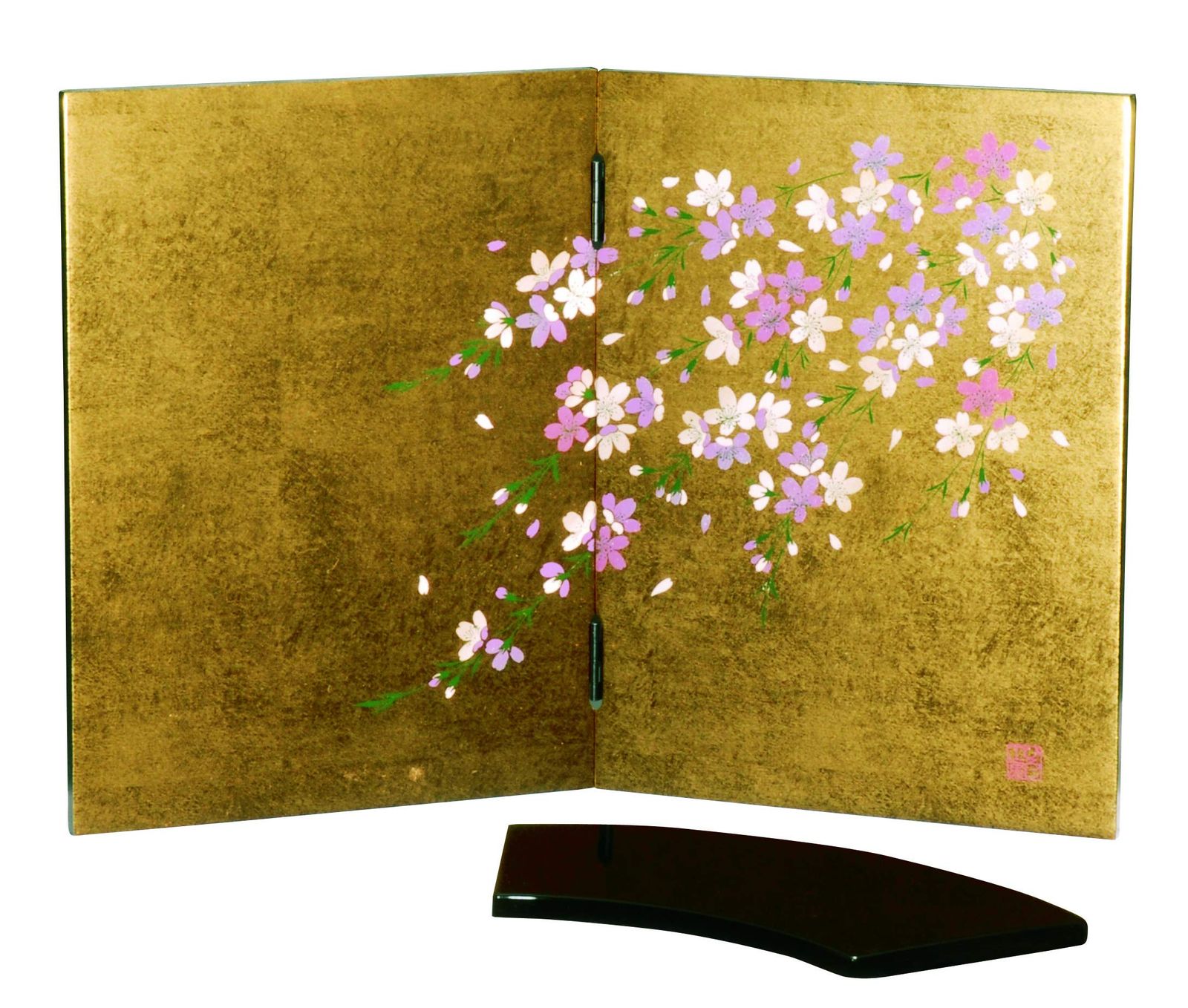 【迅速に発送】紀州のぬりもの 金箔 貼 姫 屏風 しだれ桜 金箔貼 花台付 22-87-6 衝立 屏風絵 パーティション 和 おしゃれ