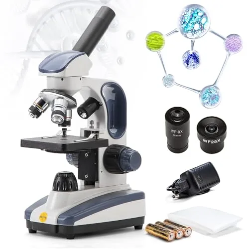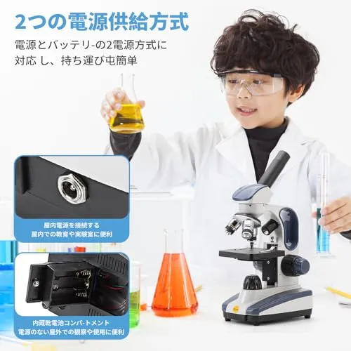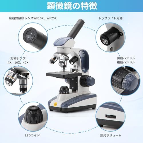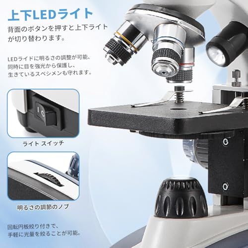 [高性能学習用顕微鏡]小学生、高校生、研究初心者向けの顕微鏡。科学の世界へようこそ!一軸式粗微動焦準ハンドルを搭載して操作はシンプルになる、ネイビーとブラックに色分けしてありますので、操作の間違いを防ぎやすくなります。