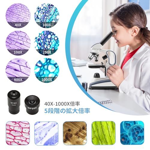 「観察しやすい広い視野接眼レンズ」収差補正DIN対物レンズ40倍、100倍、250倍、400倍、最大1000倍まで設定できます。4倍、10倍、40倍対物レンズ、広視野接眼レンズWF10X、WF25Xが付きます。
