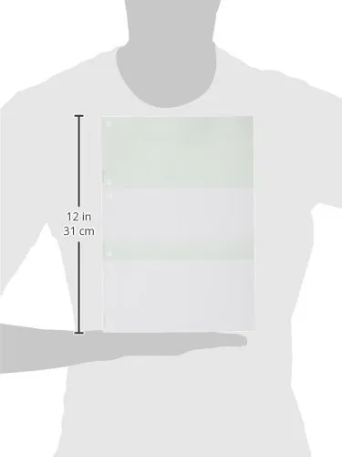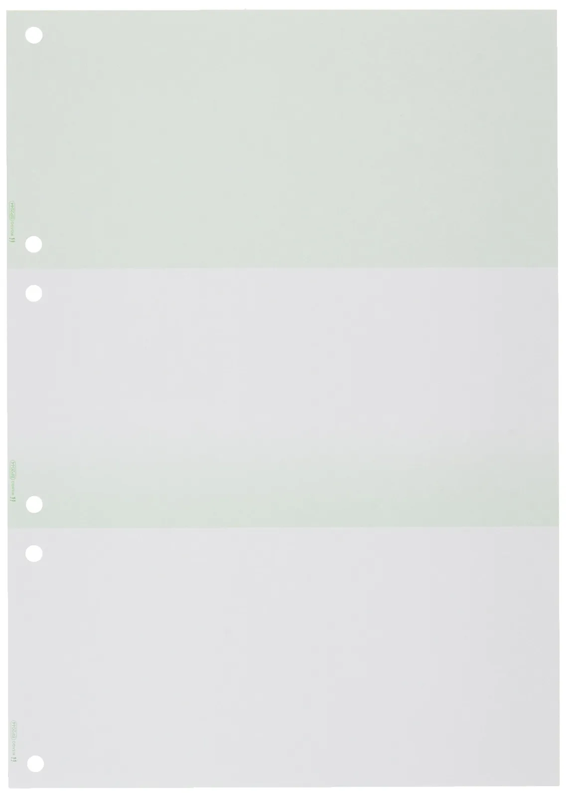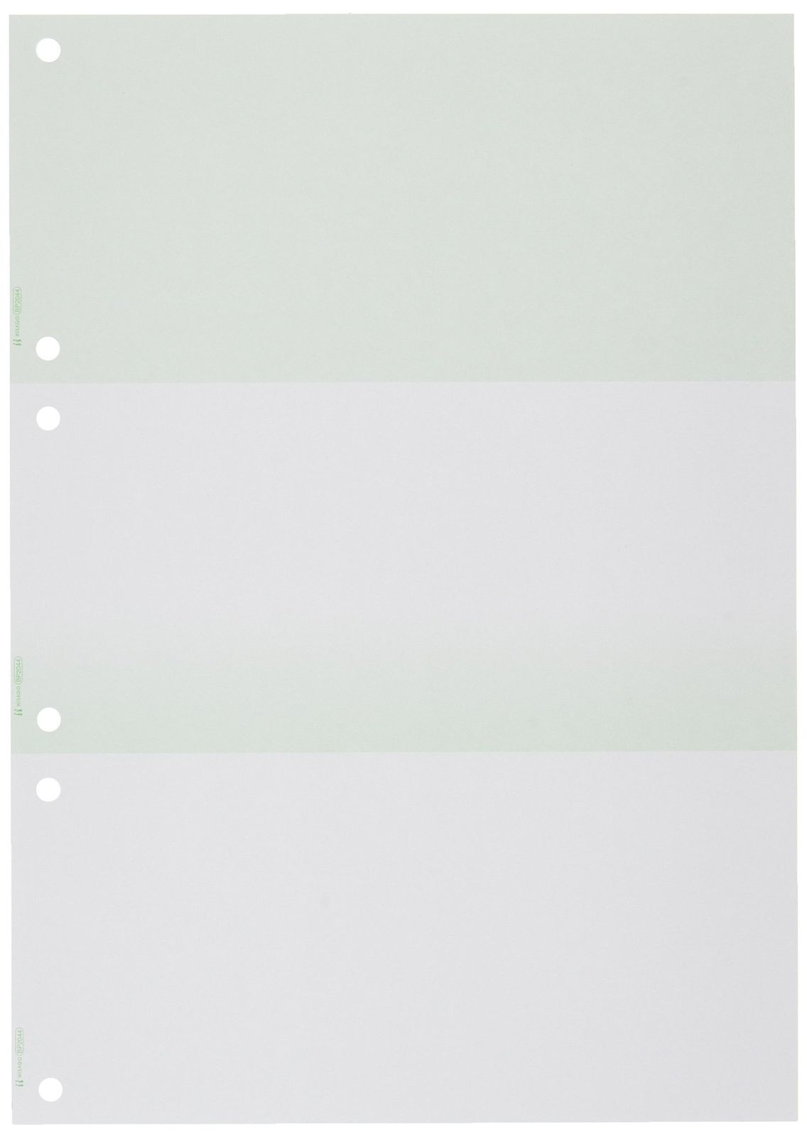 A4グリーン3面(グリーン・グリーンのグラデーション・白)。ミシン目切り離し後のサイズ:ヨコ210xタテ99mm。紙厚:0.08mm。クリアカットミシンでキレイに切り離せます。プリンタを選ばないマルチタイプ。納品書などの伝票や、社内帳票の印刷に便利。