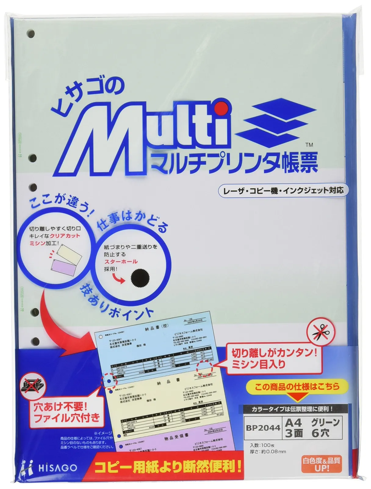 新品 ヒサゴ マルチプリンタ帳票 A4グリーン3面6穴 (100枚) BP2044