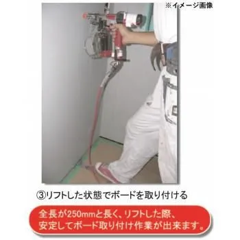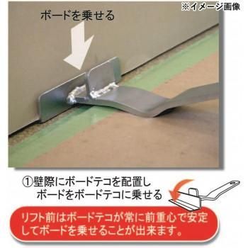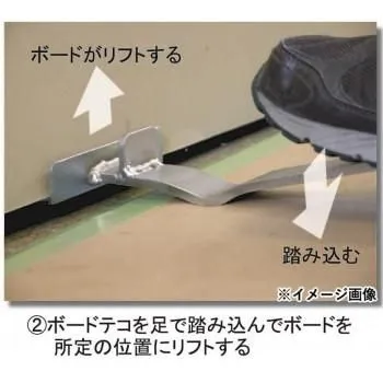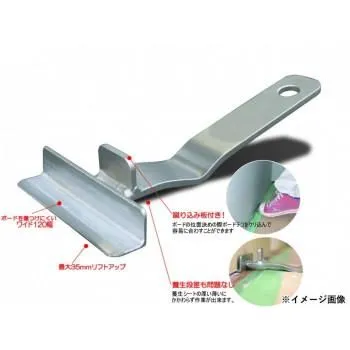 ボード設置部は120mmとワイドでボードを傷つけにくく、安定して作業が行えます。最大35mmリフトアップが可能。ボードの位置決めの際、ボードをケリ込んで安易に合わす事が出来る蹴り込み板付です。ネック部がアーチ型になっている為、養生シートの段差の厚い薄いを気にせずに作業が行えます。ボードを設置する際、ボードテコが常に前重心で固定されるので、安易にボードを載せる事が出来ます。