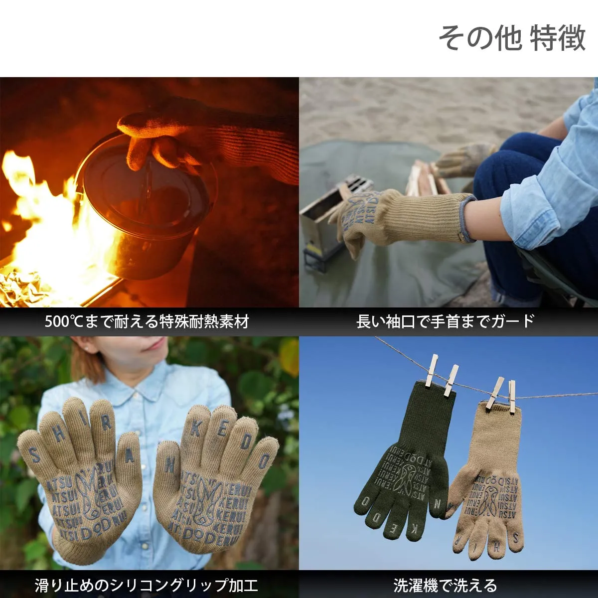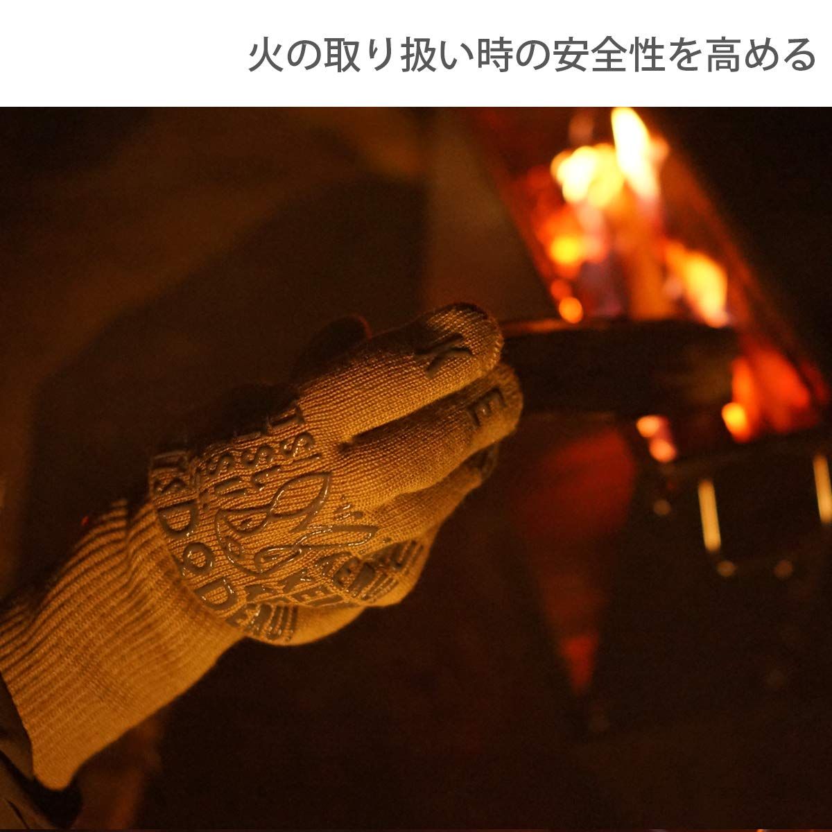 耐熱温度500℃の特殊な耐熱素材(アラミド繊維)を使用しているため、火を起こしたり薪を焚べるときの安全性を高めます。