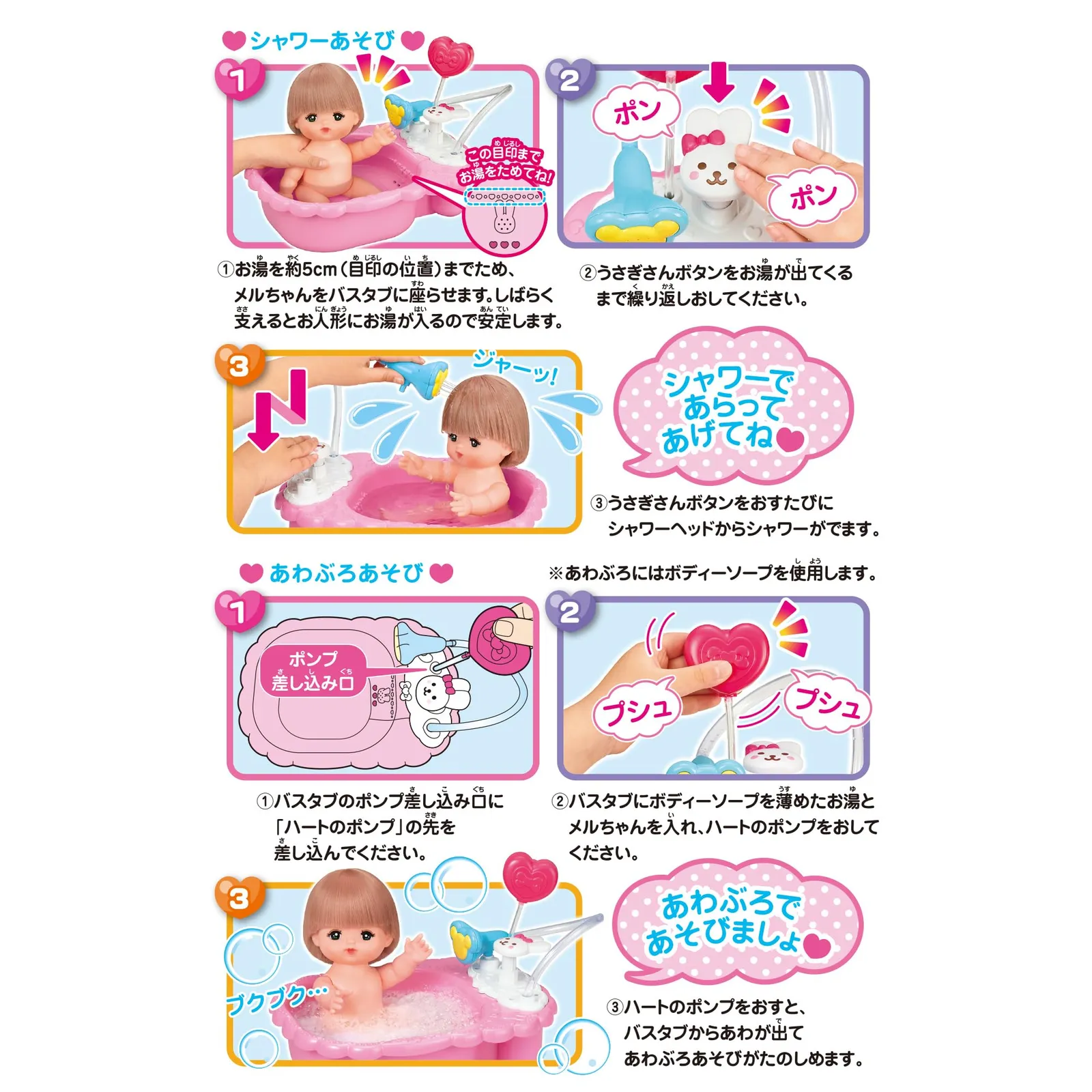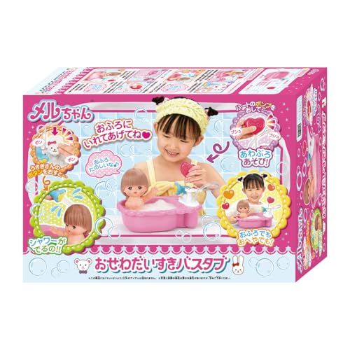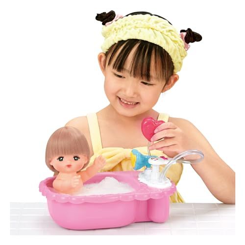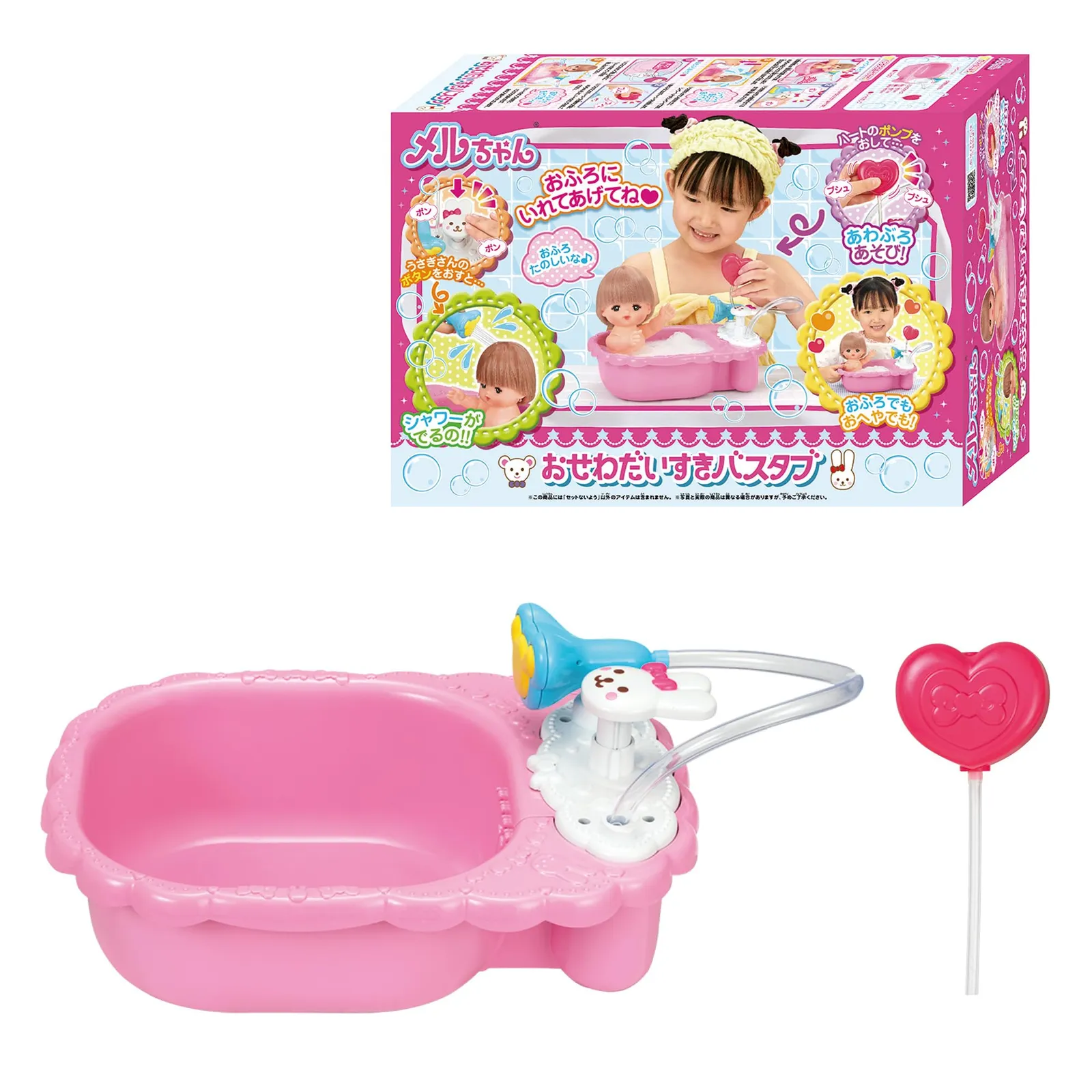 メルちゃんをおふろにいれてあげてね。 うさぎさんのボタンを押すと…シャワーが出るの! バスタブにお湯を入れて石鹸を溶かしてからハートのポンプを押して泡を立てると…あわぶろあそびも楽しめるよ!