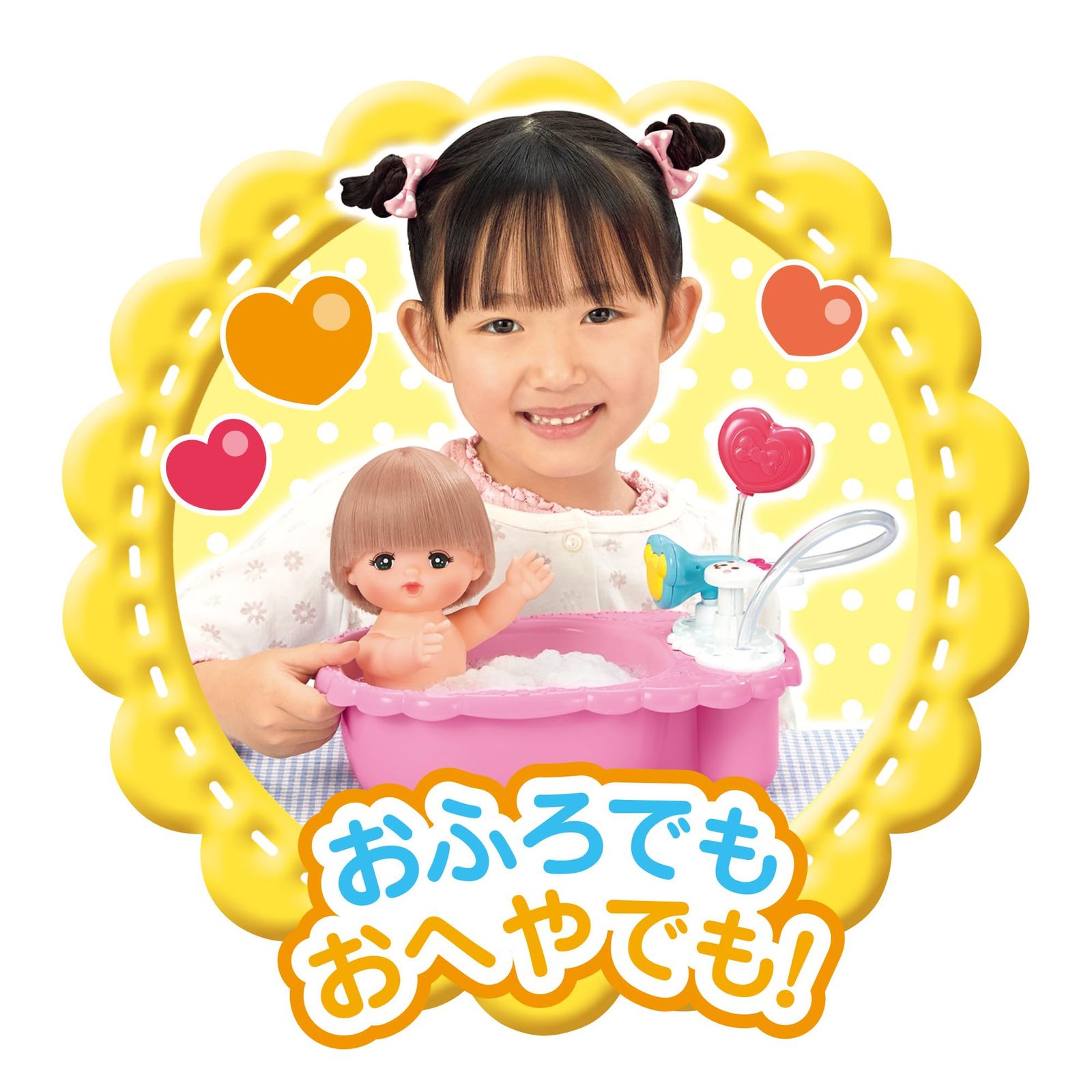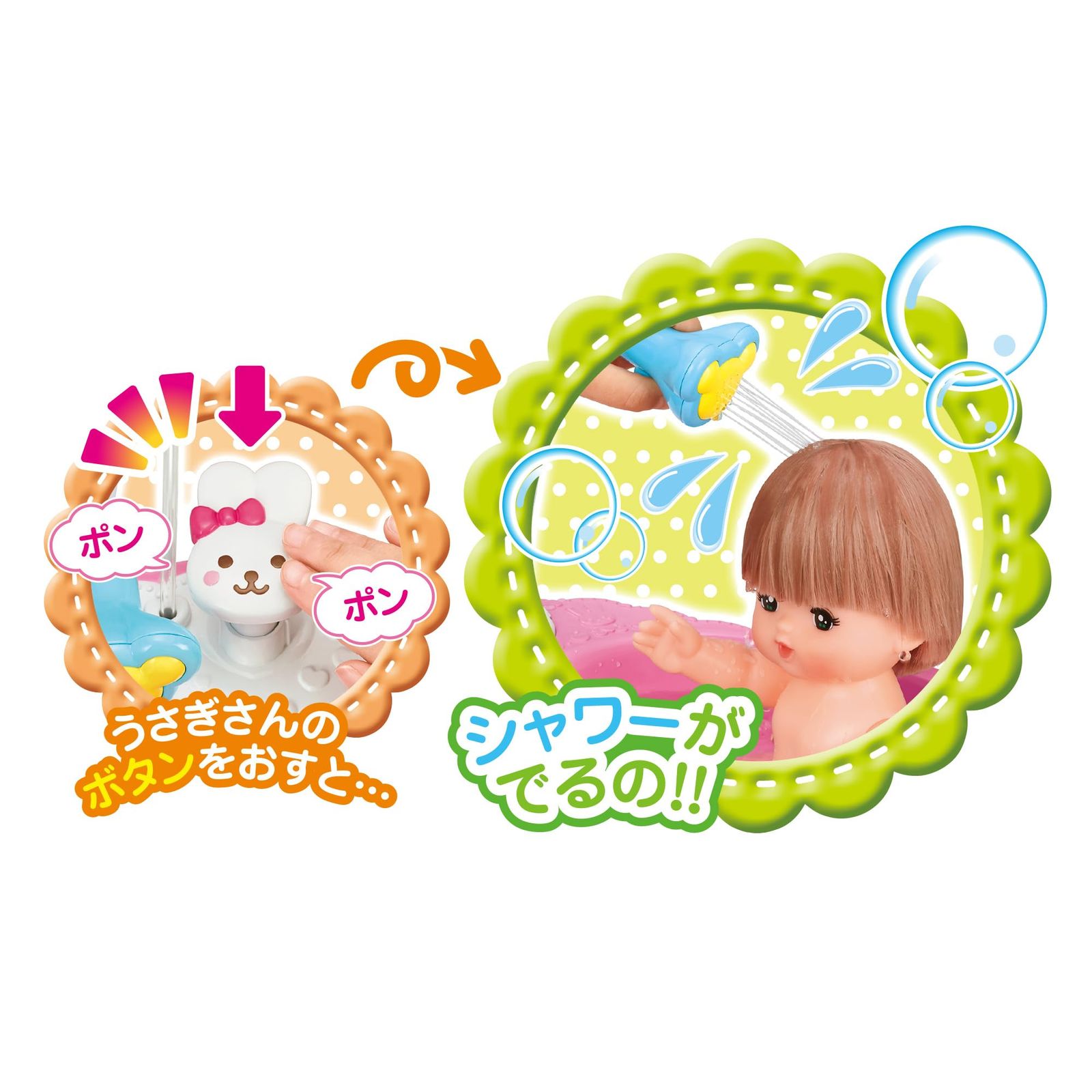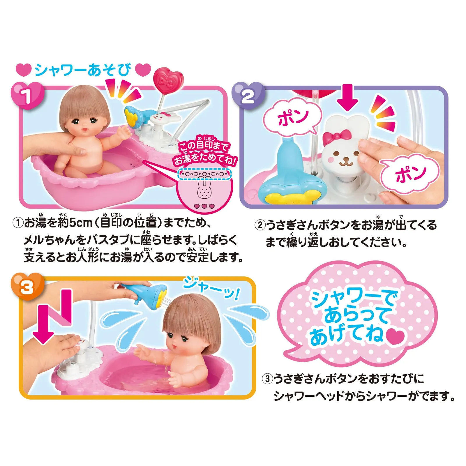 メルちゃんをおふろにいれてあげてね。 うさぎさんのボタンを押すと…シャワーが出るの! バスタブにお湯を入れて石鹸を溶かしてからハートのポンプを押して泡を立てると…あわぶろあそびも楽しめるよ!