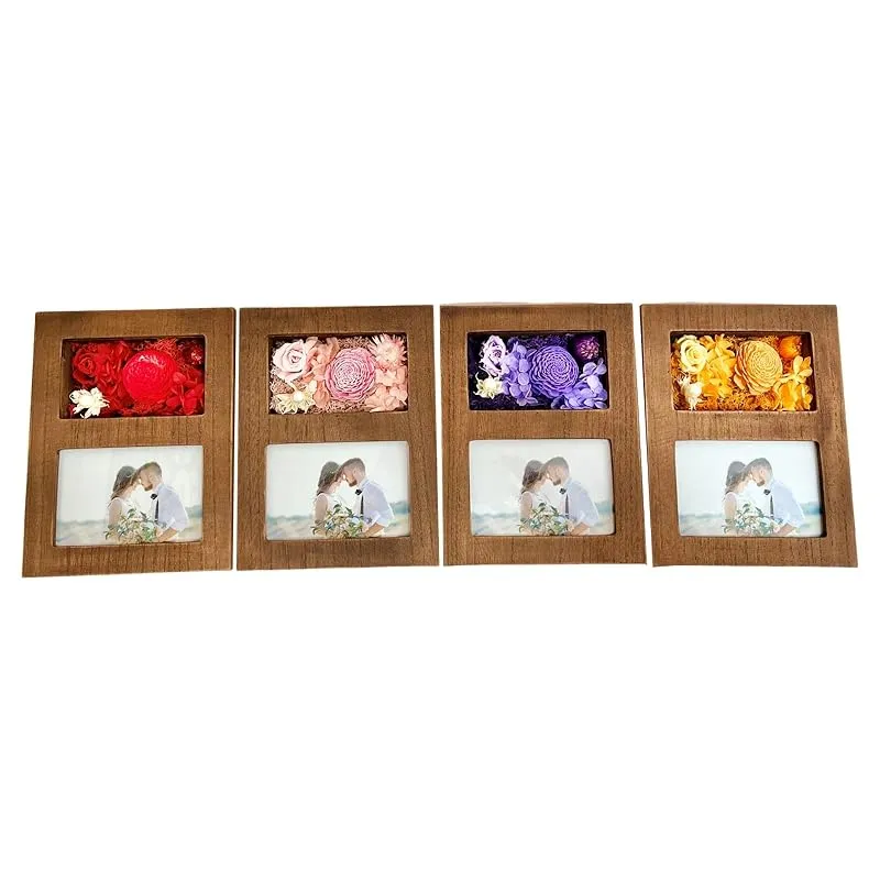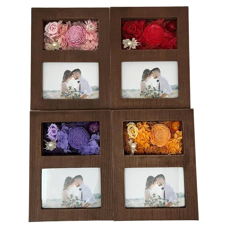 【商品概要】 W16×D3.5×H21cm レッド・ピンク・オレンジ・パープルの4色展開です。 人気のフォトフレームとプリザーブドフラワーのアレンジメントです。