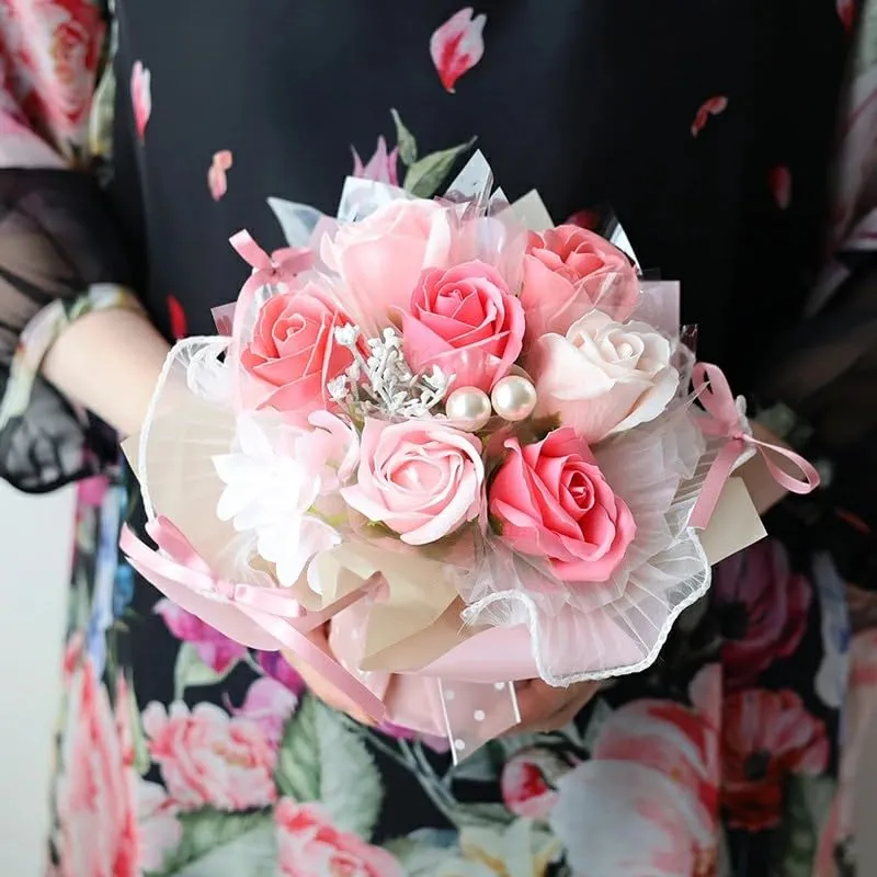 【母の日に贈る、やさしい香りと華やかさ。パールのソープフラワー花束】 大切なお母さんへ、感謝の気持ちを込めて。本物の花のように美しく咲き続けるソープフラワーのブーケです。上品なパールとリボンのアクセント、エレガントなレースチュールが、お母さんの毎日を華やかに彩ります。