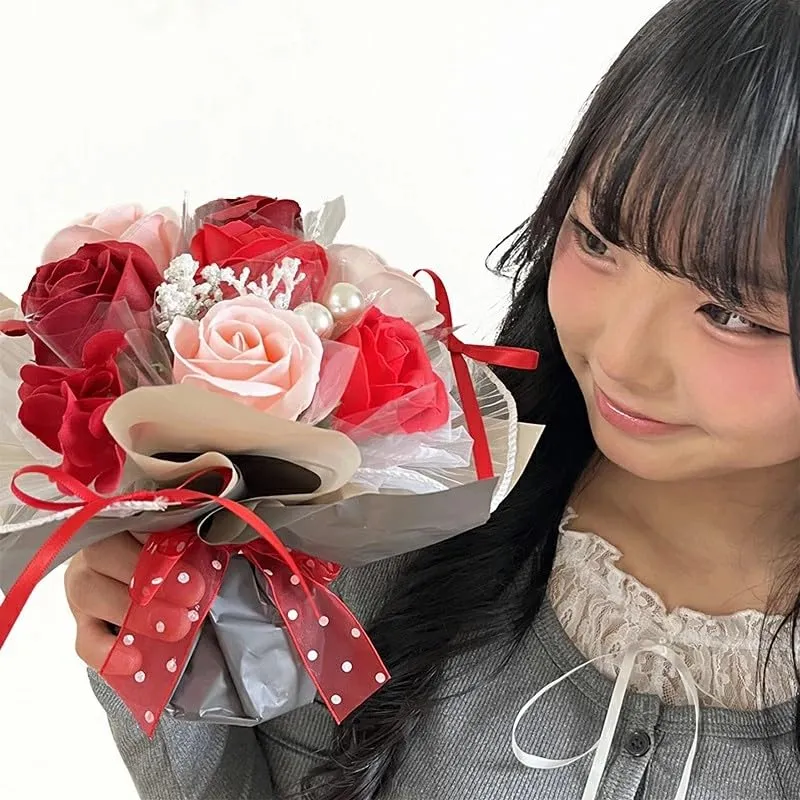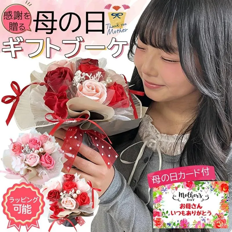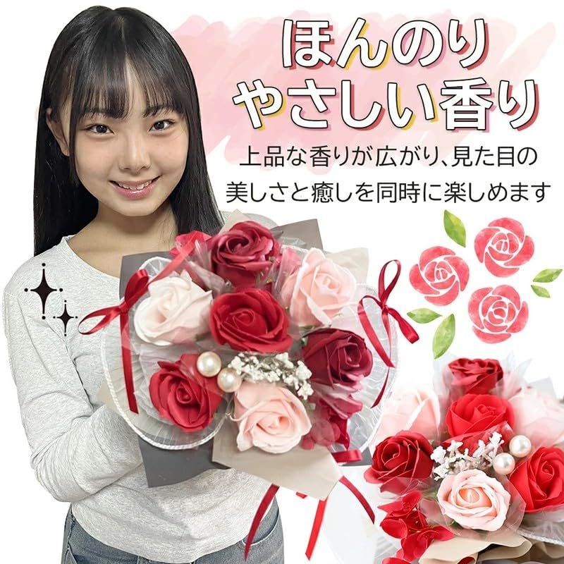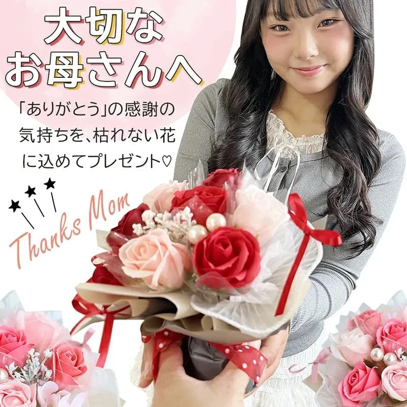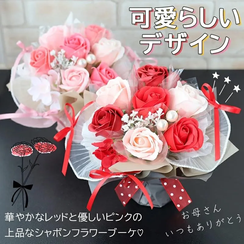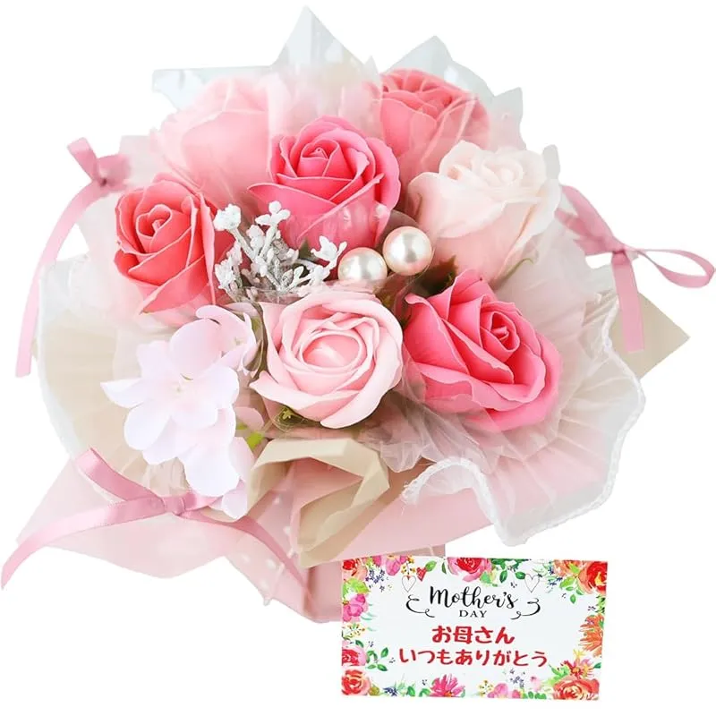 【商品仕様】 ・セット内容:ソープフラワー(バラ)、パール・リボン装飾、メッセージカード ・特徴:スタンドタイプ(自立型)、お手入れ不要、ほのかな香り付き ・主な用途:母の日、誕生日、結婚祝い、記念日、退職祝い、お見舞い、お礼