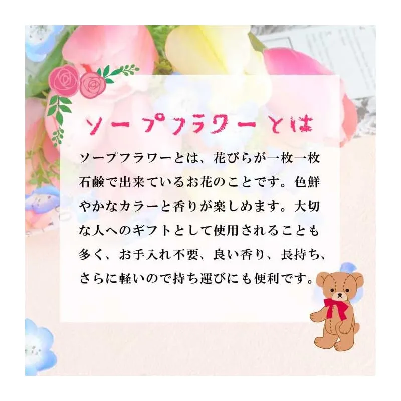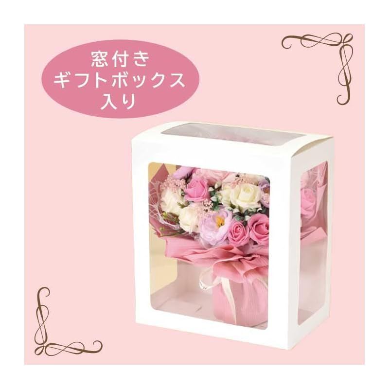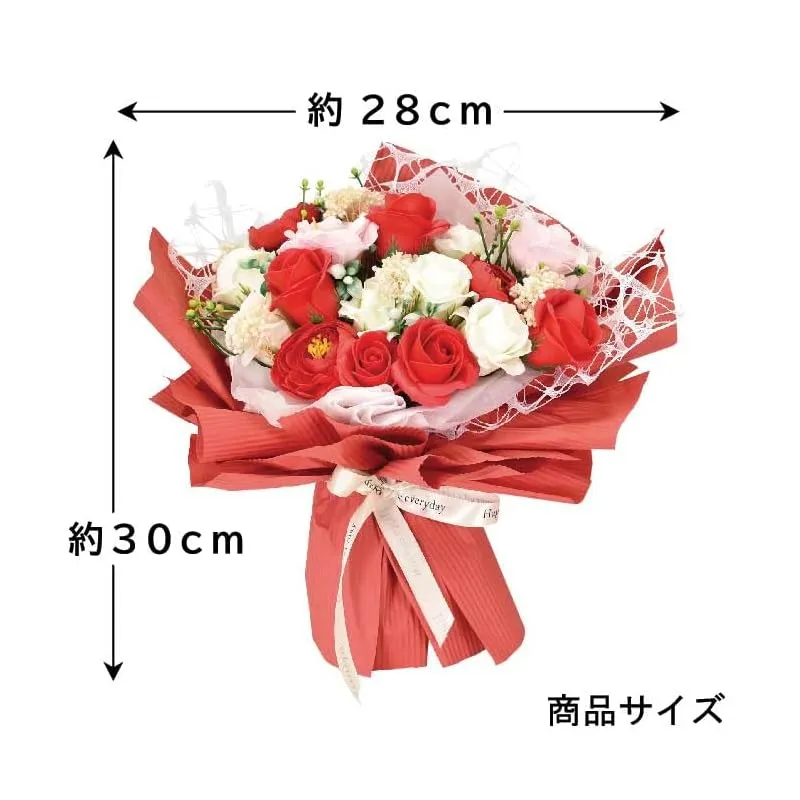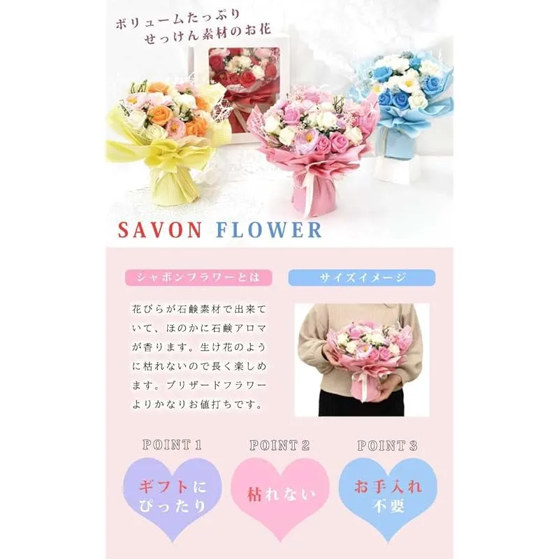 【商品概要】 ボリュームたっぷりでおしゃれな見た目です。 飾ると美しく、良い香りがするので母の日のプレゼントにぴったりです。 シャボンフラワーは、生け花やプリザーブドフラワーに代わる「第3のフラワーギフト」と言われています。