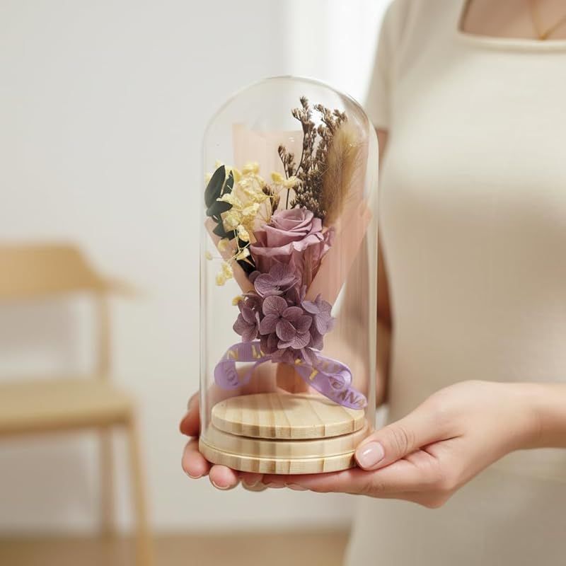 【商品概要】 φ8×H15.5cm ガラスドームに入ったプリザ&ドライフラワーのアレンジです。 ピンク・グリーン・ミックス・ブルー・オレンジA・オレンジB・ホワイト・パープル・ピンクの9色展開です。