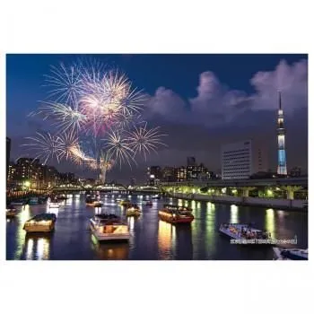 その土地にかかわる風景や物なども含めて有名なものをパズルにした、シリーズ「日本の都市」。墨田川花火大会の花火打ち上げ数は約2万発。当日には屋形船も多数出て95万人ほどの人出でにぎわう、東京下町の大規模な夏の風物詩です。