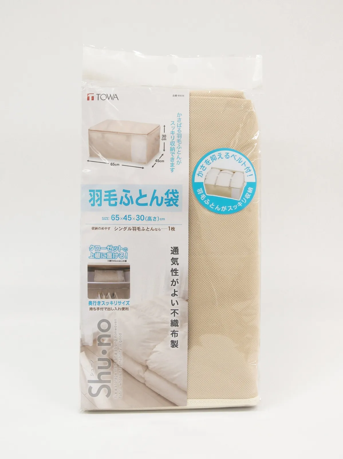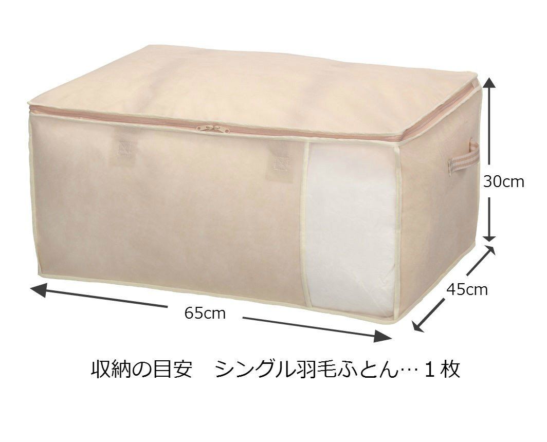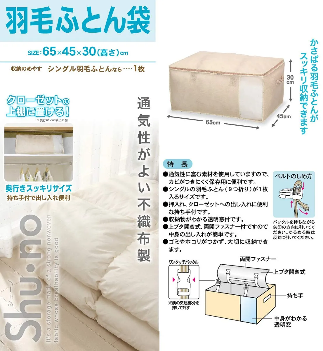 ●羽毛ふとんを収納する前に・・・羽毛ふとんは必ず陰干しやふとん乾燥機でよく乾燥させ、ホコリやゴミを取り除いてください。(乾燥が不十分だとダニ・カビの発生する原因となる) 通気性がよい不織布製 かさばる羽毛ふとんがスッキリ収納できます。 通気性に富む素材を使用していますので、カビがつきにくく保存用に便利です。 シングルの羽毛ふとん(9つ折り)が1枚入るサイズです。 押入れ、クローゼットへの出し入れに便利な持ち手付です。 最後までご確認頂き誠にありがとうございました。 上記をご確認頂き、ご購入いただけましたら幸いです。 何かご不明な点がございましたらお気軽にメッセージからお問い合わせ下さい。 配送について、土日祝は配送業務がお休みとなります。 ご了承ください。 宜しくお願い致します。