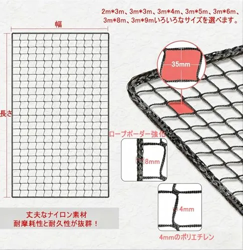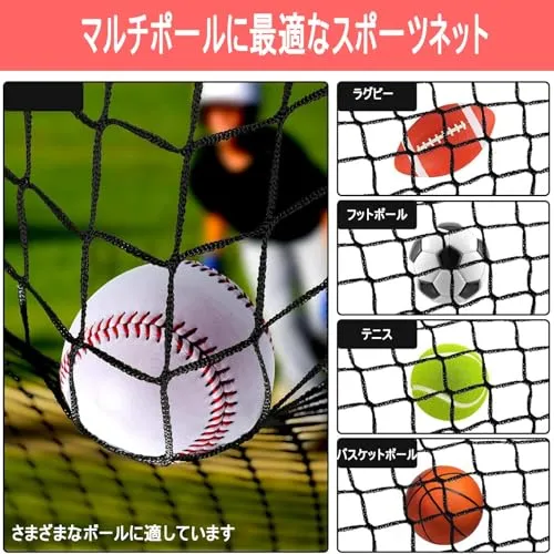 【多目的ネット】:このネットは、養生ネット、ガーデニングネット、防鳥防獣ネットとして、建築現場やDIYプロジェクト、庭の作業など、さまざまな場面で幅広く活躍します。作業現場での安全性やプライバシー保護にも効果的です。ガーデニングや農業で使用されることもあります。植物のサポートやクリーピング植物のための絡まり防止ネットとして利用されることがあります。 場所:室内 屋外 運動場 体育館 練習場 運動:軟式 硬式 野球 防球 キャッチボール等。
