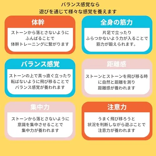 遊び方:ストーンを子供の歩幅に合うよう、交互に並べ、距離をあまり空けずに配置してください。距離を開けるほど難易度がアップしバランス感覚も養えます。また、カラーホイールを使って、色に合わせてジャップしましょう。