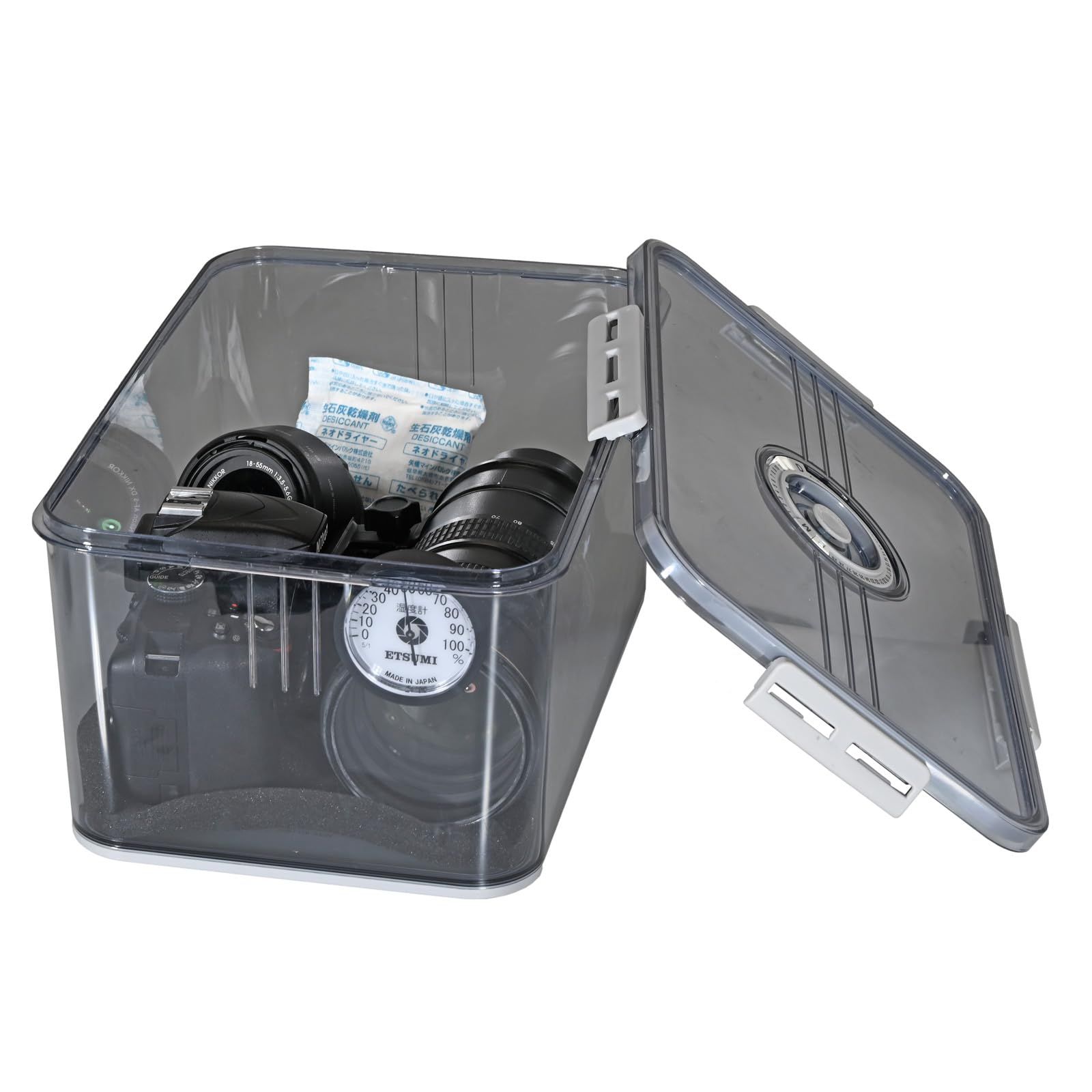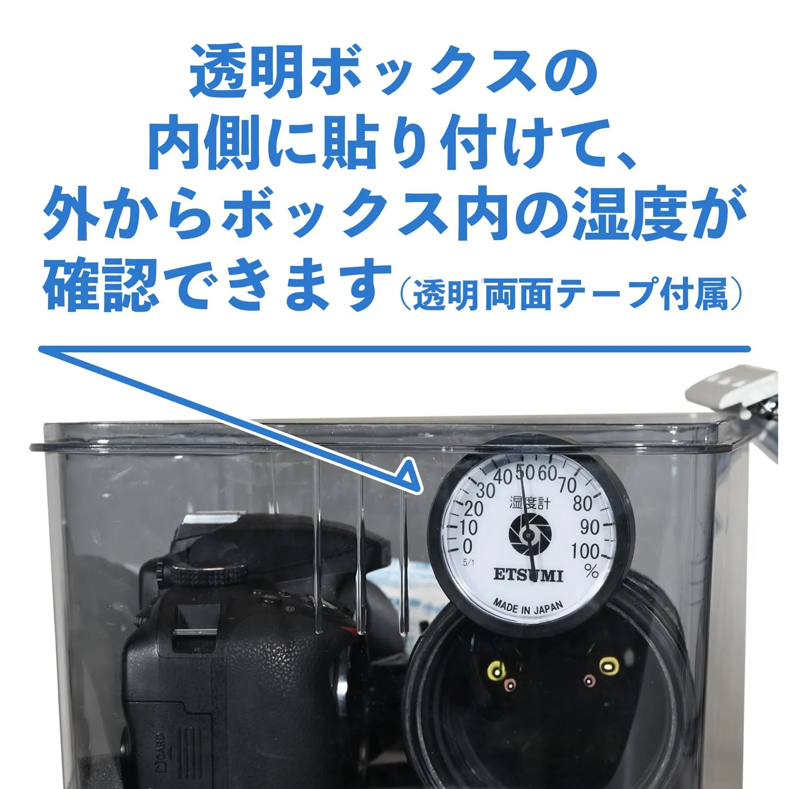 【保管ボックス外からも簡単に確認】本体表面はフラットな設計で、付属の透明両面テープで保管ボックス内側に貼り付けが可能。ボックスの外からでも中の湿度が確認でき、わざわざ開ける手間が省けます。