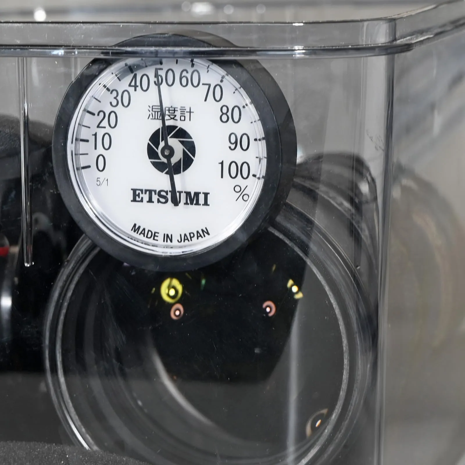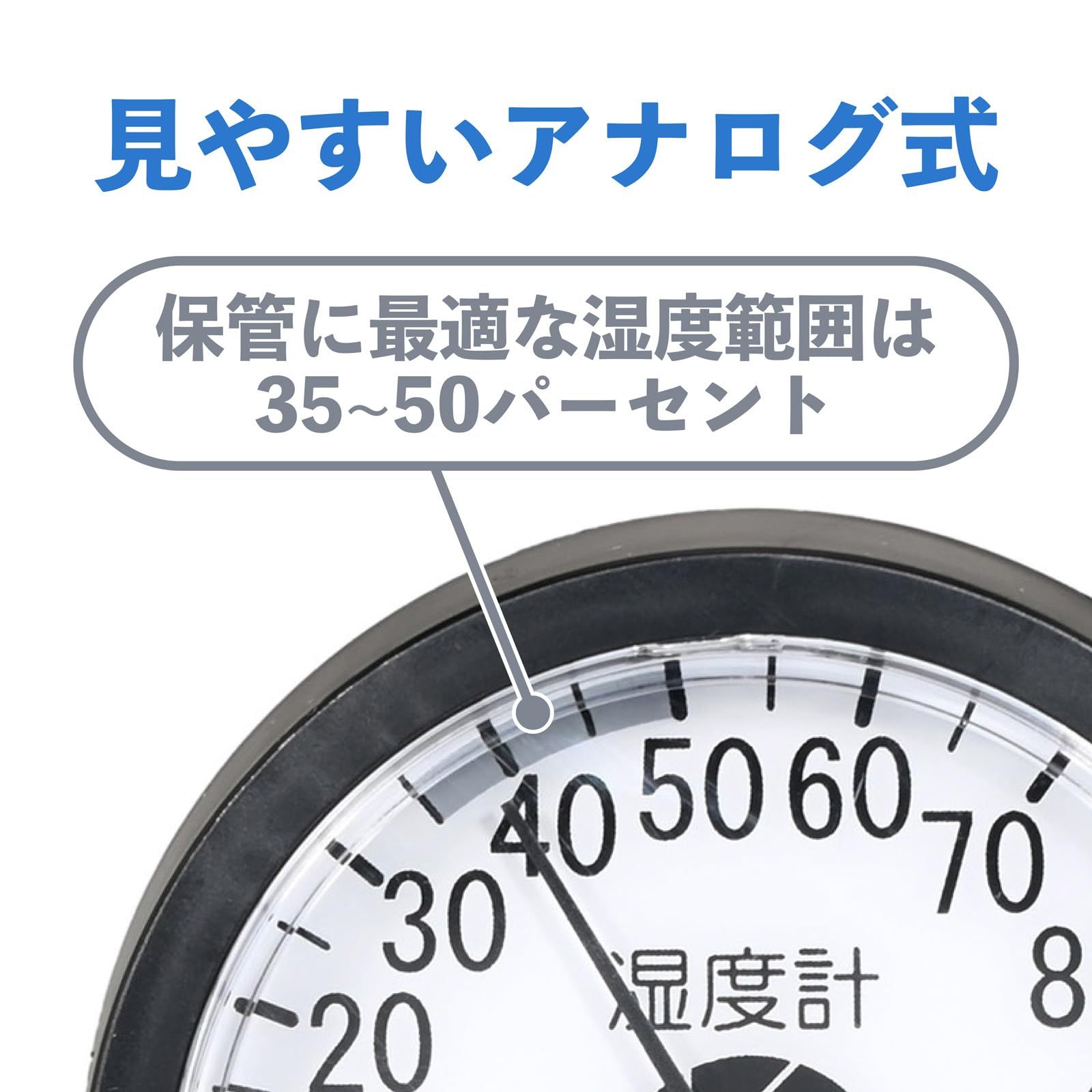 ●日本製 カメラとレンズの湿度管理でカビの予防に】カメラやレンズの保管場所の湿度を一目で確認できるアナログ湿度計。湿度管理が重要なカビの原因を防ぎ、撮影機材を長持ちさせます。保管に最適な湿度範囲は35~50%。適正範囲の目盛り部分はグレーで色分けされており、視覚的にわかりやすくなっています。