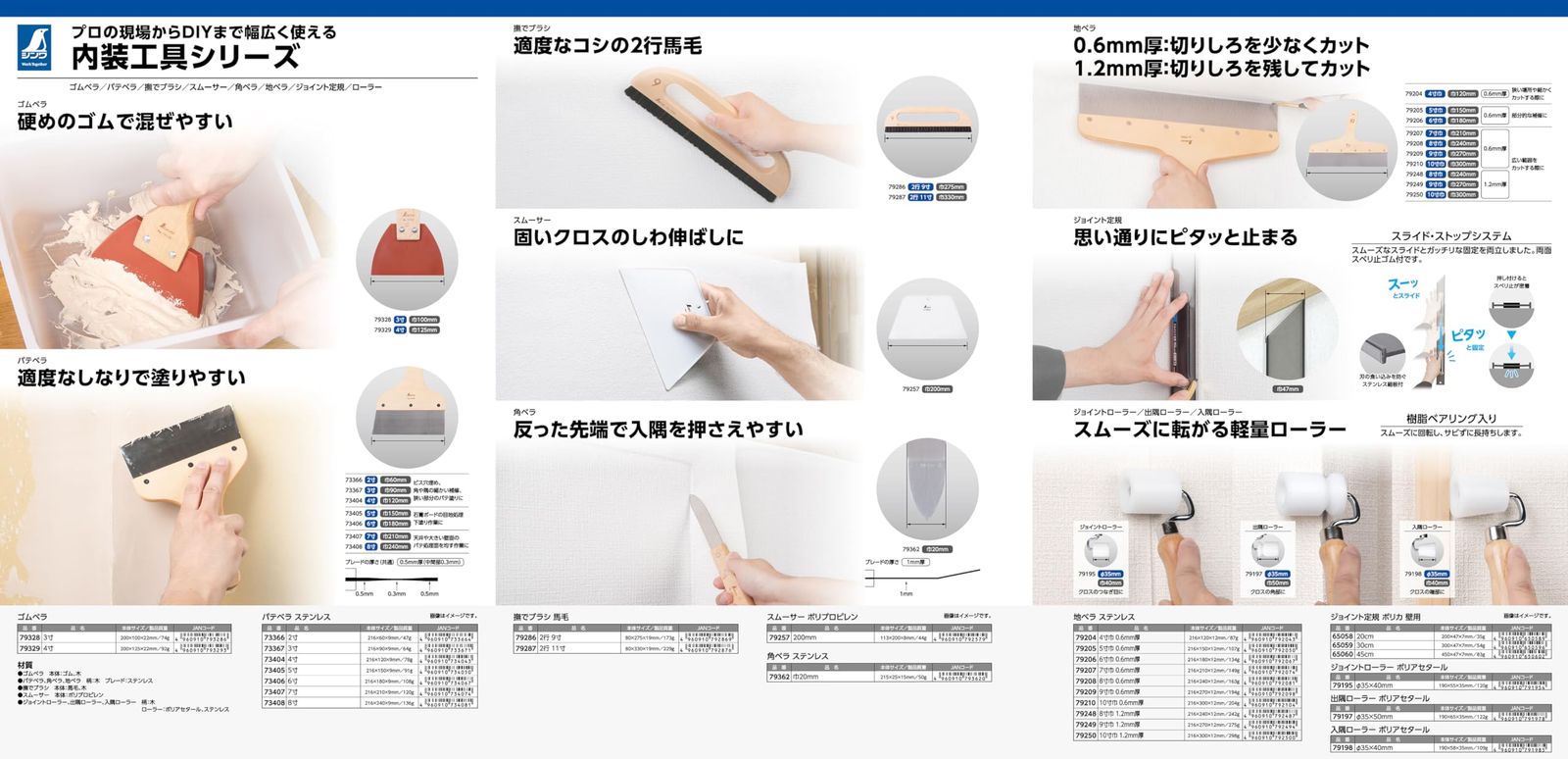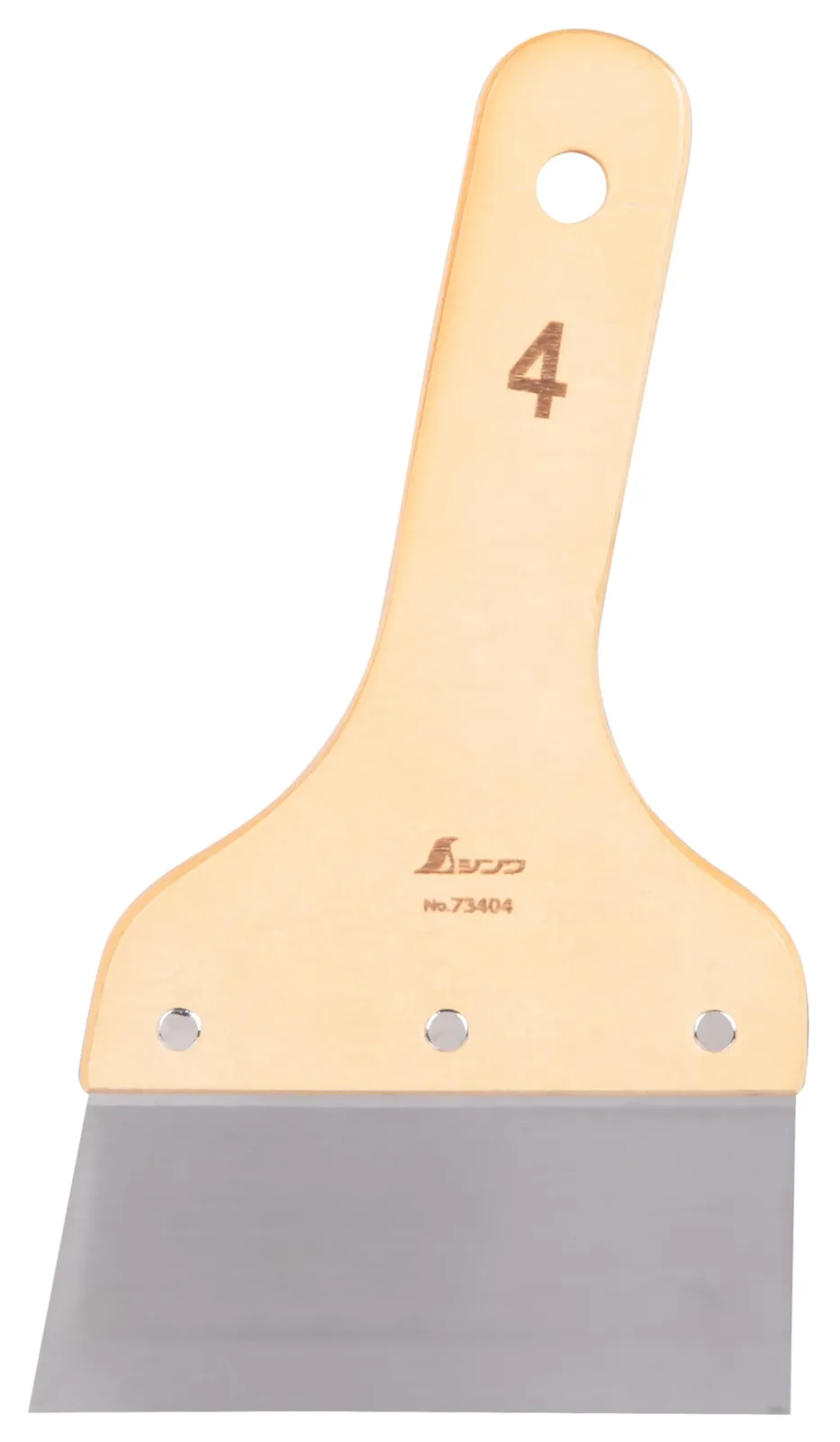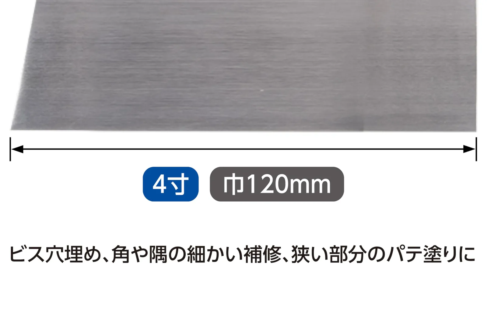 【仕様】 ・サイズ:4寸 ・巾:120mm ・材質:[柄] 木 [ブレード] ステンレス ・ブレード厚:0.5mm厚(中間部0.3mm) 〈ブレードの厚さ〉0.5mm(中間部0.3mm) 〈ブレード巾〉先端120mm ブレードの中間部が薄くなっており、適度なしなりがありパテを塗りやすい。 ビス頭や小さなキズの補修に最適。小回りが利くため、ピンポイントな修正に便利です。 5寸よりもさらに小回りが利く為、リフォーム現場などで点在するちいさなキズを効率よく埋めていくのに適しています。 一般的なキズの補修から、石膏ボードの継ぎ目にパテを充填する最初の工程などに。 最後までご確認頂き誠にありがとうございました。 上記をご確認頂き、ご購入いただけましたら幸いです。 何かご不明な点がございましたらお気軽にメッセージからお問い合わせ下さい。