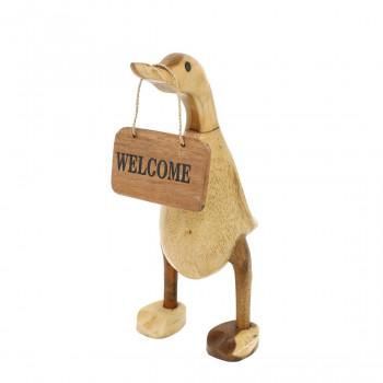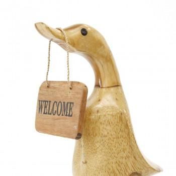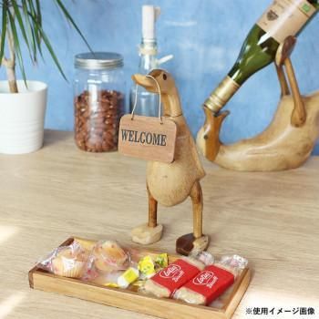 くちばしにウェルカムボードを引っ提げてお出迎えしてくれる木彫のアヒル。玄関先やお店のレジ横に置いて、気持ちが和む空間を演出してみませんか?