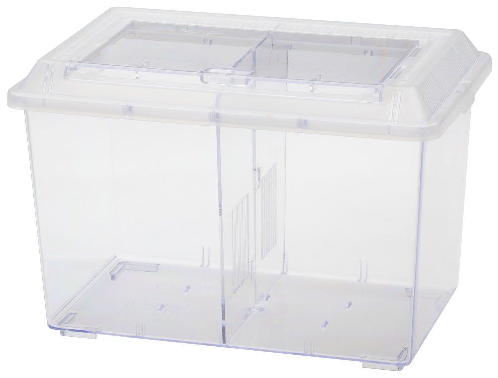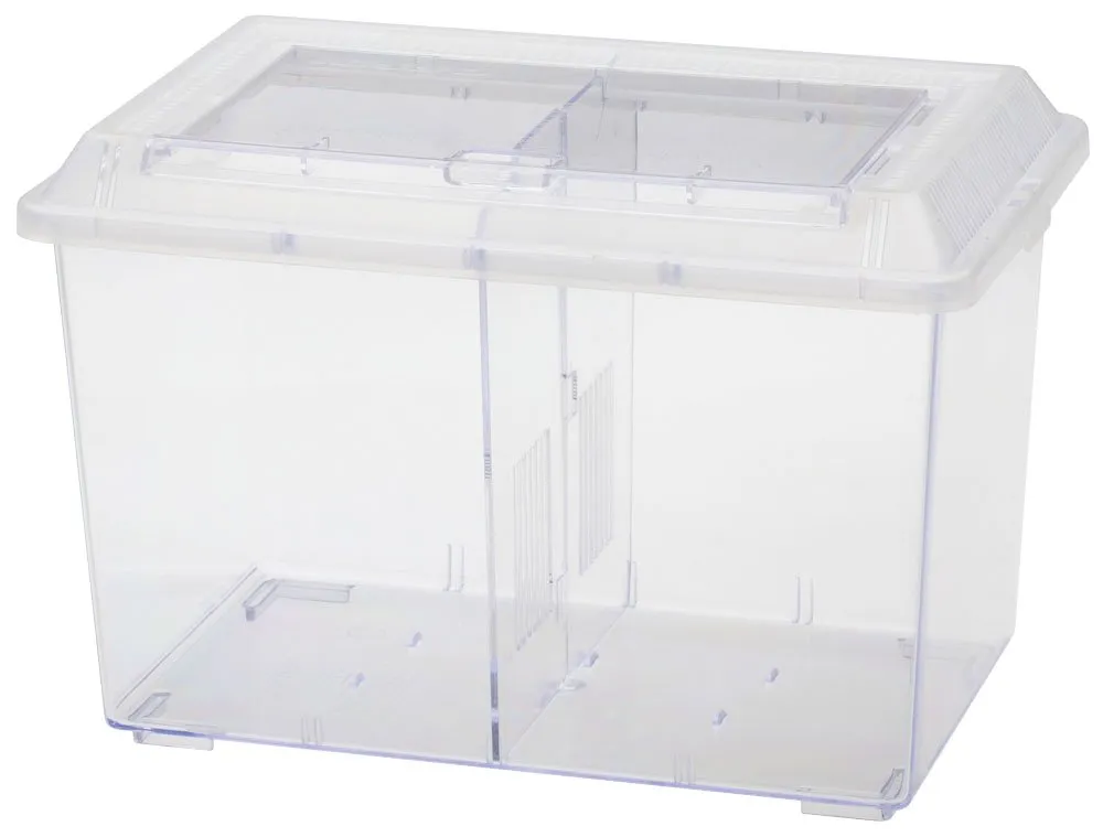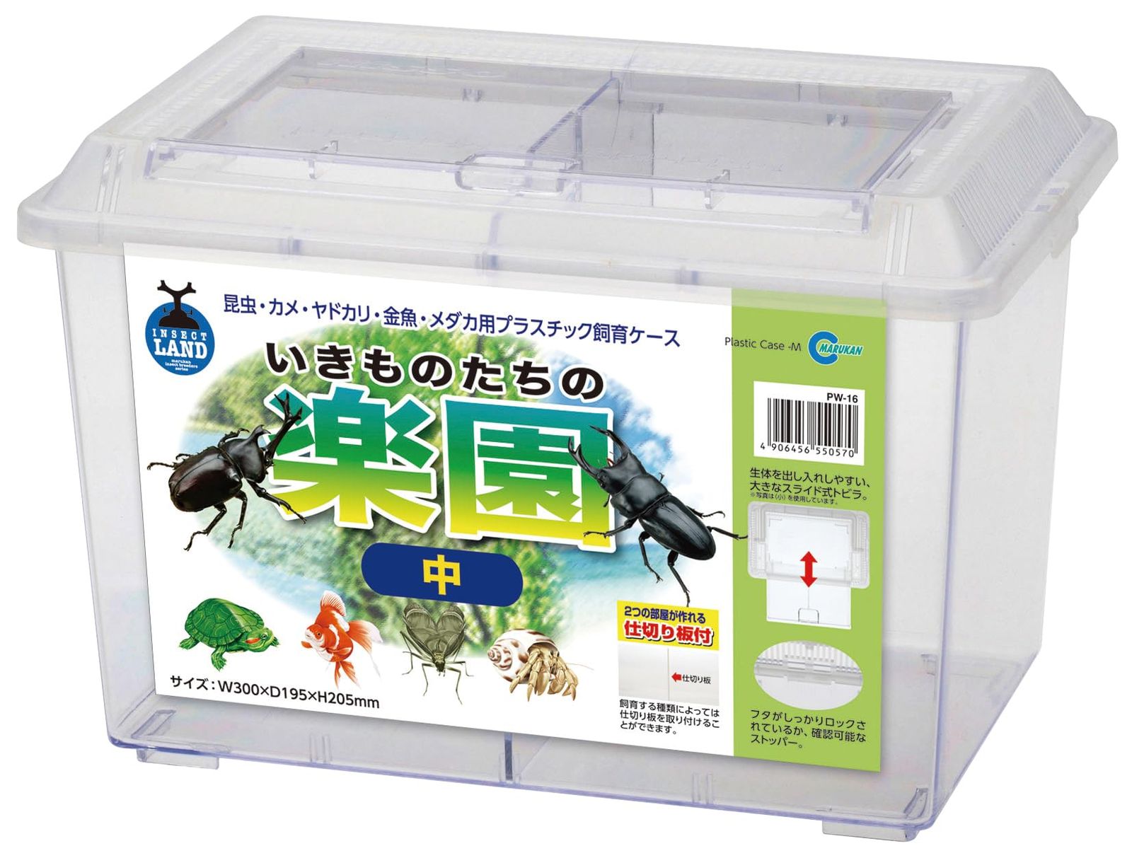 生体の観察、出し入れしやすい大きなスライド式トビラ。フタのロックが確認可能なストッパー、2つの部屋が作れる仕切り板付きです。