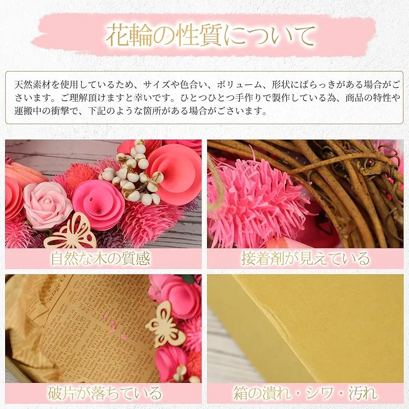 【商品概要】 ??装飾リース:花屋の手作りで、スライスした木を花のように配置しています。鮮やかなピンクを基調に、さまざまな色のイチゴ、バラのソープフラワー、かわいい蝶をあしらっています。ユニークな組み合わせで、その魅力に抵抗できません。リースには紐が付属しているので、お好きな場所に置いてお楽しみいただけます。 ?? 長い歴史と多様な起源を持つ花輪は、さまざまな機会の贈り物として適しています。リースは幸福を象徴し、素敵でロマンチックな贈り物です。母親に愛と幸福を伝える人気の母の日ギフトです。春は再生と回復の象徴であり、新居に引っ越す友人への贈り物としても贈ることができます。幸運と美しさを象徴し、結婚式のドアの装飾としてよく使用されます。 ??完璧なギフト:スライスした木から独自に作られ、特別に加工された花です、色移りや変色している部分がある場合がごさいます。美しさと実用性を兼ね備えています。バラの石鹸の花に、濃いおがくずの花とイチゴの果実を組み合わせ、生き生きとした豪華な外観を実現します。高級感のある質感でギフトにも最適です。リースは母の日の贈り物に最適です。 ??花輪の伝説:花輪は永遠の幸福の象徴であると言われています。古代ローマやギリシャでは、勝利や栄誉、祝賀を祝うために花輪(特に月桂冠)がよく使われていました。これらは幸運、繁栄、神への敬意を象徴するためにドアに掛けられます。北欧やケルトの文化では、花輪は自然崇拝と密接に結びついています。冬の常緑の花輪は生命の継続を象徴し、春の花輪は再生と収穫を表し、万物の復活と新しい生命の始まりを表しています。花輪は結婚式やその他のお祝い事でも使用され、歓迎と祝福を表すためにドアに掛けられます。モダンなリースのドア装飾は装飾としてよく使用され、家に自然でお祝いの雰囲気を加えます。花輪は通常、再会、幸福、幸運を象徴し、訪問者を迎えるためにドアに掛けられます。アジアでは、春節や結婚式の際に、縁起の良さと美しさを象徴する花輪のドア飾りを使うことも人気になっています。 ?1年間の: 顧客満足が最優先事項です。ご質問がある場合は、いつでもお気軽にお問い合わせください。当商品はの倉庫からのとなります。現状倉庫システムの関係上、横向きに梱包されて届く場合がございます。倉庫への納入時に横向きに梱包されても破損がないように十分注意はしておりますが、万が一、到着した商品に問題がありましたら、いつでもお気軽にお問い合わせください。