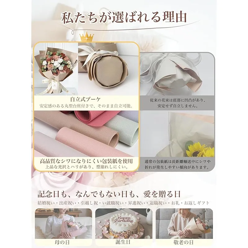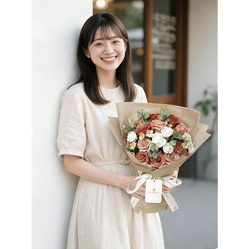【商品概要】 感謝の気持ちを伝える母の日人気ギフト 明るく元気な印象を与える「薔薇」のソープフラワー花束は、母の日にぴったりのプレゼント。枯れない花だから、お部屋や玄関のインテリアとしても長く楽しめます。香り付きで見た目も華やか、毎日忙しいお母さんに「ありがとう」の気持ちを込めた人気ギフトです。 ソープフラワーが選ばれる理由:1.手入れ不要で枯れない!長く美しさを楽しめます。2.プリザーブドフラワーよりボリュームたっぷり。3.鮮やかな色彩と優しい石鹸の香りで癒されます。4.花粉がないため、アレルギーの心配が不要。5.見た目も香りも楽しめる理想のフラワーギフト。 ギフトボックス付きで贈り物に最適:専用ギフトボックス&手提げ袋付きで、すぐにお渡し可能。しっかりしたボックスで高級感を演出し、無料のメッセージカードも付属。花束サイズ:約32×16×9cm、総重量:約520gと、ボリューム感たっぷりの華やかなプレゼントです。 取扱い上の注意:1.観賞用のため石鹸としては使用できません。2.直射日光を避けてください。3.変色や色抜けの原因になります。4.水分に弱く、花びらがくっつく恐れがありますので、水気には十分ご注意ください。 多様なギフトシーンに対応:誕生日、母の日、敬老の日、結婚祝い、開業祝い、記念日、バレンタインデー、退職祝いなど、あらゆるシーンで活躍するフラワーギフトです。ビジネスギフトやイベント、ホームパーティーにも最適。特別な気持ちを届ける贈り物として幅広くお使いいただけます。