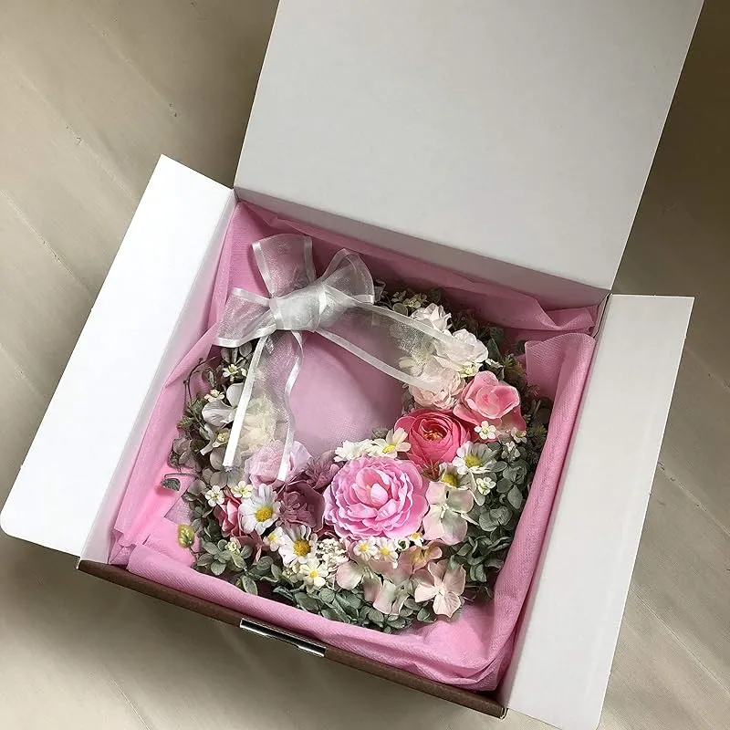 【商品概要】 明るく元気な気持ちになれるように、 ピンクのお花達をいっぱい詰め込んで作ったリースです。 アーティフィシャルフラワーの、 ラナンキュラス、バラ、デージー、小花、 プリザーブドフラワーのアジサイを使用してます。 お部屋の模様替えに飾っていただければ、華やいだ気分を感じられるかと思います。 また贈り物として、引越祝い、新築祝い、開店祝い、記念日、お誕生日、ご結婚祝いとしてのご利用もよいかと思います。 サイズ:約φ26cm×7