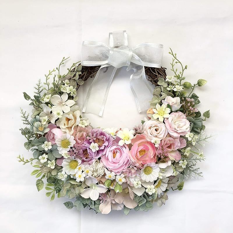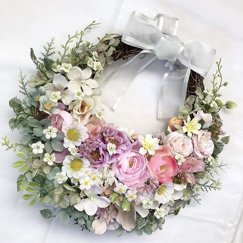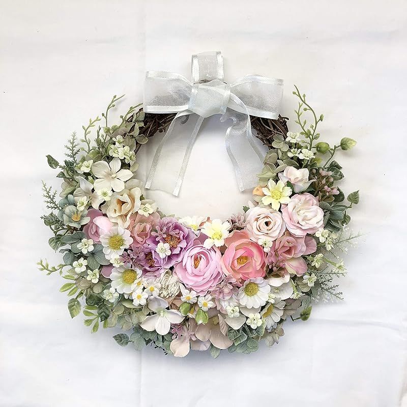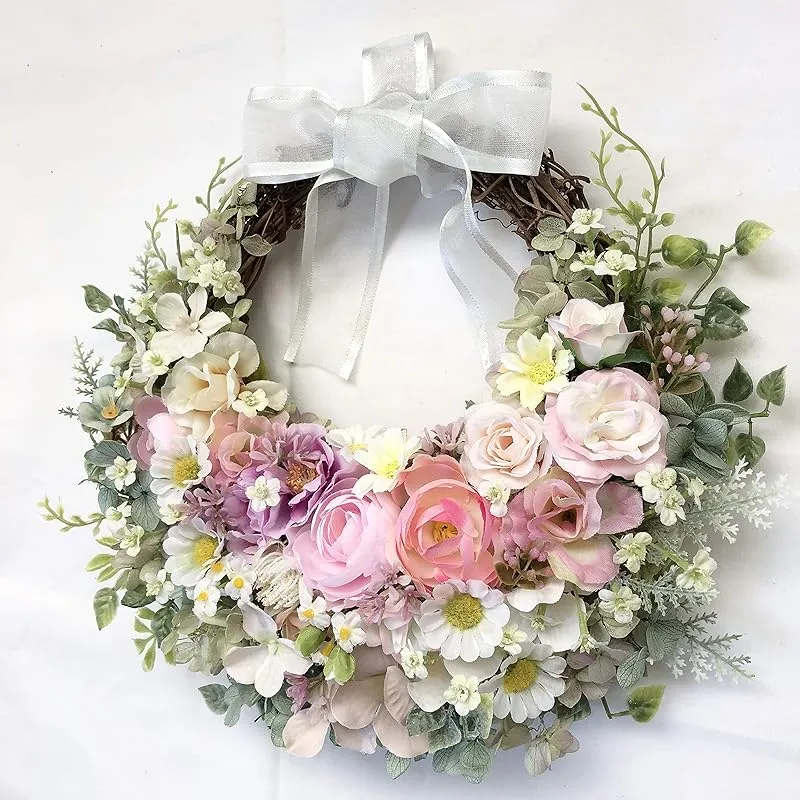 【商品説明】 明るく元気な気持ちになれるように、 ピンクのお花達をいっぱい詰め込んで作ったリースです。 アーティフィシャルフラワーの、 ラナンキュラス、バラ、デージー、小花、 プリザーブドフラワーのアジサイを使用してます。 お部屋の模様替えに飾っていただければ、華やいだ気分を感じられるかと思います。 また贈り物として、引越祝い、新築祝い、開店祝い、記念日、お誕生日、ご結婚祝いとしてのご利用もよいかと思います。サイズ:約φ26cm×7