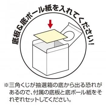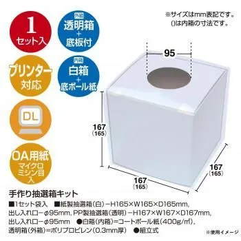 ■ラッピング(包装)対応不可です。 オリジナル抽選箱を作ろう。印刷してスッと差し込むだけ、専用用紙付き。マイクロミシン入り。 ※現品は組立加工しておりません。 ※三角くじが抽選箱の底から出る恐れがあるので、付属の底板をセットしてください。 サイズ白箱(内箱):高さ165×幅165×奥行165mm・出し入れ口:直径95mm、透明箱(外箱):高さ167×幅167×奥行167mm・出し入れ口:直径95mm 個装サイズ:35.4×20.3×1.5cm 重量270g 個装重量:270g 素材・材質白箱(内箱):コートボール紙、透明箱(外箱):ポリプロピレン 仕様組立式 セット内容白箱(底ボール紙付き)、透明箱(底板付き)、OA用紙(側面用4枚(マイクロミシン入り/165×165mm)、天面用ミシン目抜き1枚(穴あき直径95mm))、テスト印刷用紙(側面用天面用各1枚) 生産国日本 fk094igrjs おすすめ 商品番号:ab-1938008 ※代引き不可 同梱不可※北海道、沖縄、離島送料は別途お見積り。※手配完了後は、ご注文キャンセルを承る事が出来ません。何かございましたら事前にお問い合わせ下さい。