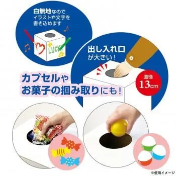 27cmのビッグサイズでよく目立ちます。出し入れ口は13cmなので冬場に厚着していても手が入りやすいサイズです。出し入れ口が大きいので、紙製のくじ以外にもボールやカプセルを使った抽選ができます。白無地なのでイラストや文字を書き込めます。専用の「目隠しーと」を付けると中が見えません。