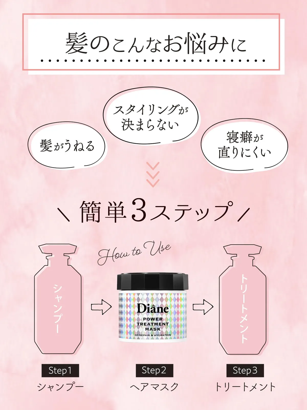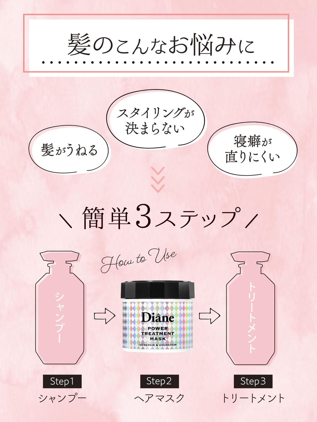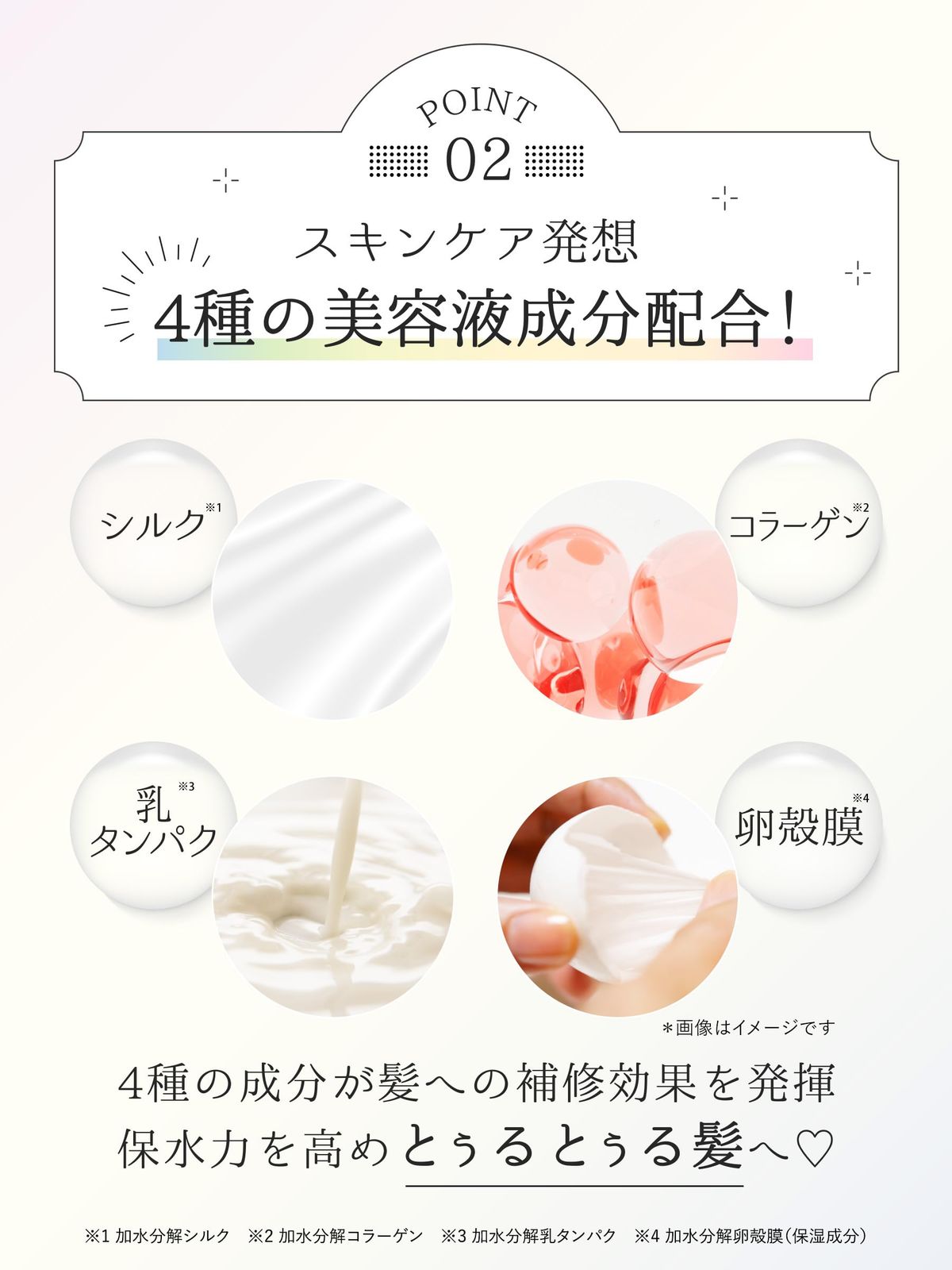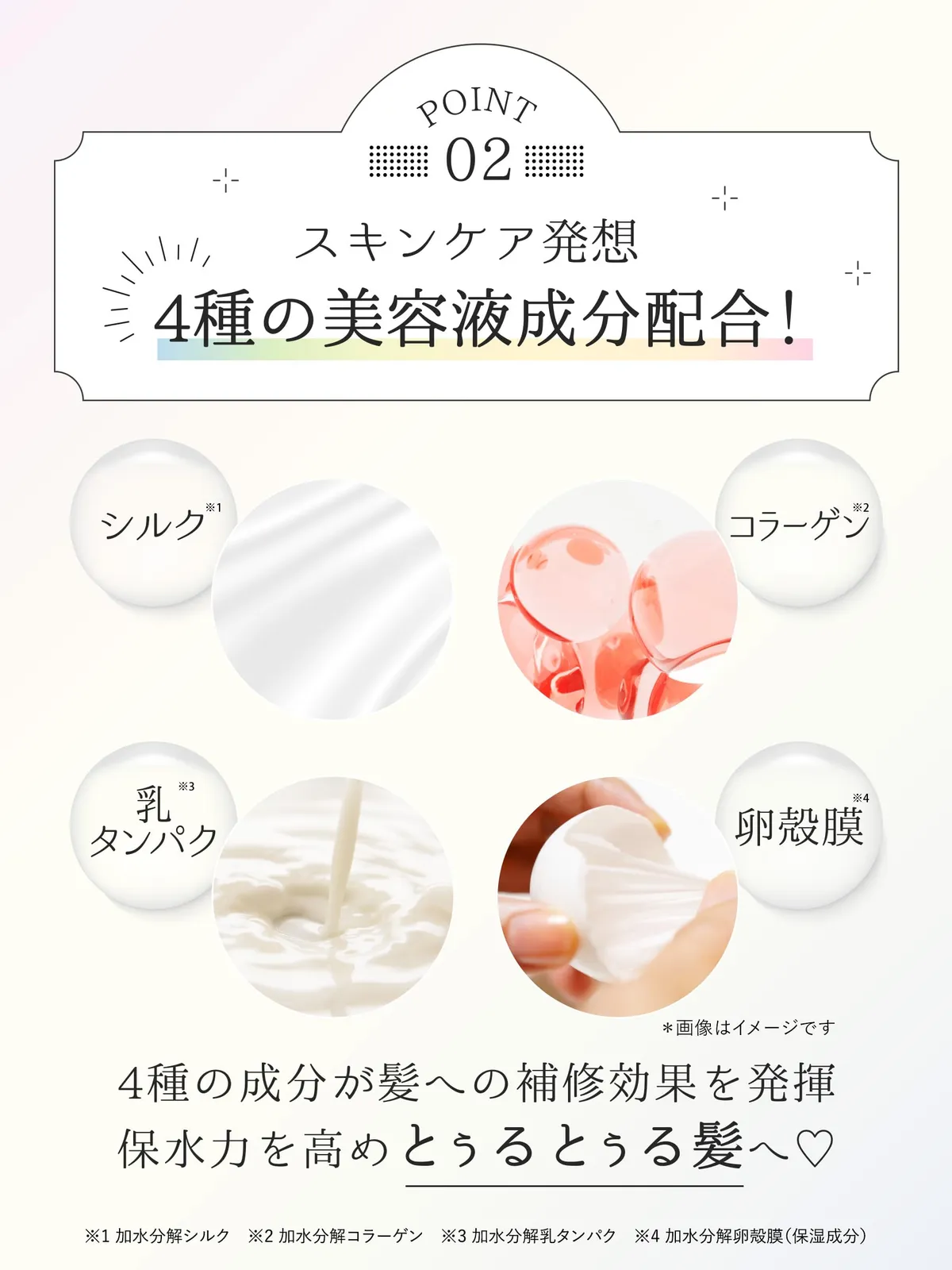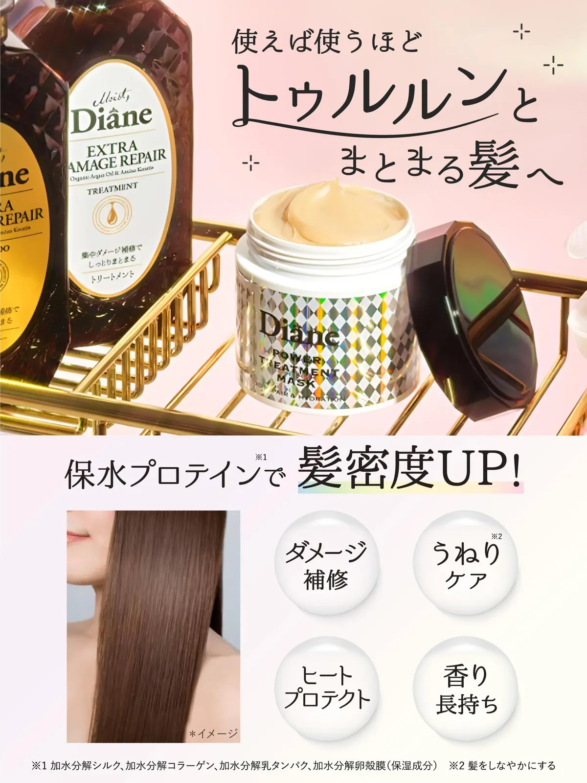 ダメージ髪の深部・内部・キューティクルまで浸透し、たっぷり保湿して集中補修。高保水プロテイン(*1)が髪の内部に浸透して水分をため込み(*2)、使うたびに髪をしなやかにし、うねりをケアします。使えば使うほど、しっとりまとまるトゥルン髪へ。