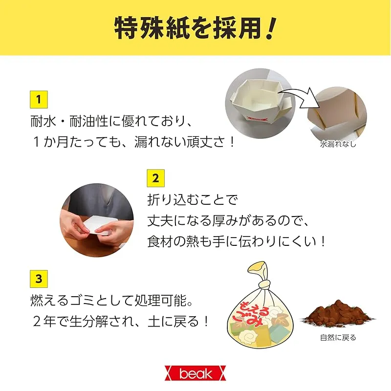 ■燃やしてOK、埋めてもOK。地球にやさしい紙の器 beakはバージンパルプ100%。 燃やしても有害物質ゼロ、海や土壌に埋めても生分解されます。 使用後はコンパクトに畳んで捨てられるから、後片付けもラクラク。 エコ・サステナブル・省スペースな理想の使い捨て食器です。