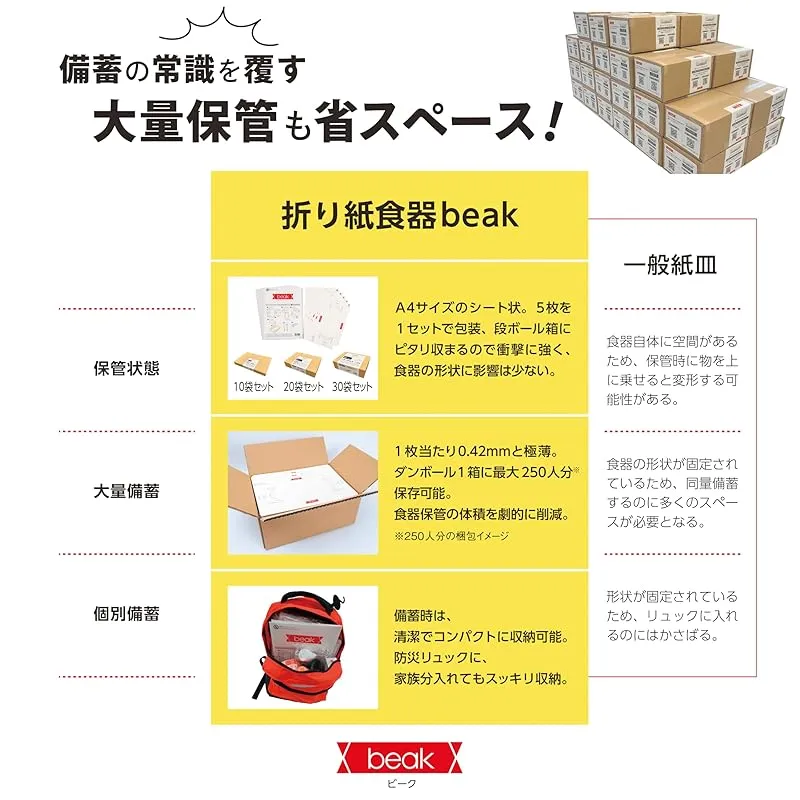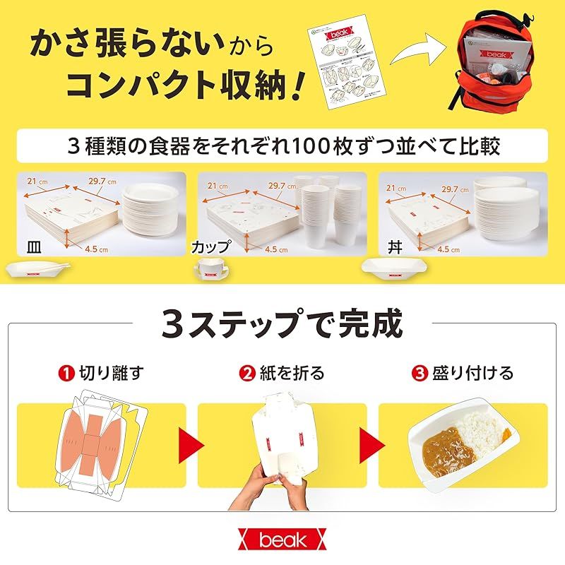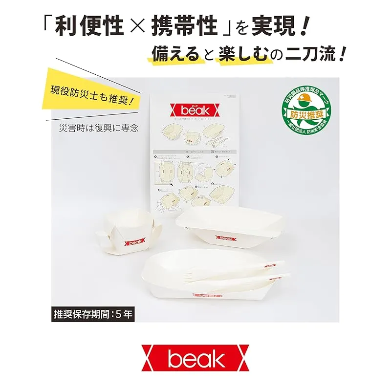 ■「備える」と「楽しむ」の二刀流!折り紙から生まれる万能食器 防災備蓄にも、アウトドアにも。 beak(ビーク)はA4サイズの紙1枚から折る“折り紙食器”。 耐水・耐熱・耐油仕様で、カレーや汁物もOK。 キャンプ・ピクニック・フェス・屋外イベントでも活躍し、 災害時には備蓄食器として心強い味方になります。 普段の「楽しさ」、“もしも”の「備え」に対応する、新しいスタイルの紙食器です。