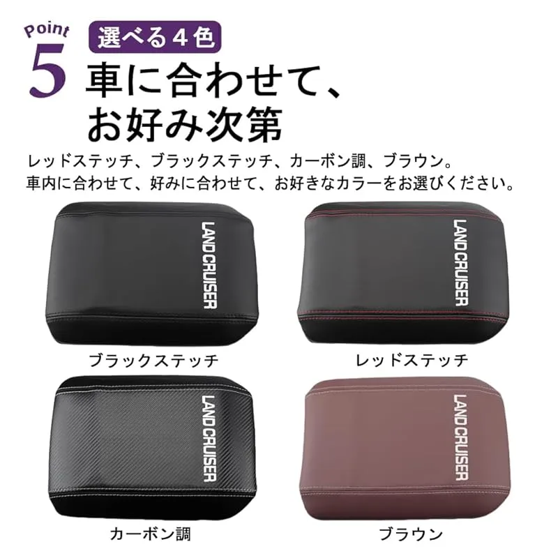 【商品概要】 対応車種:ランドクルーザー 250系。 ※お車と画像をご確認頂いた上、お買い求めくださいませ。 素材良い:素材には高品質レザー採用。耐摩擦・通気性・高耐久が特長で、見た目の質感も良い。丈夫な材質で、長期に渡ってご利用頂ける。 ファッション:レザー生地で、高級感あふれる。精緻な連結技術で、ファッション的な連結、優美な曲線は、車内の色を豊かにする。表面にはロゴが付いています。まるで純正品のように見えます。 お好きなカラー:レッドステッチ、ブラックステッチ、カーボン調、ブラウン。車内の色を豊富したい方にも、車内の色に合わせたい方にも、ぜひお試してください。 取り付け簡単:被せるだけの簡単取付。車種別専用設計なので、コンソールボックスカバーに被せるだけでピッタリフィット。届いたその日にスグ着けられる。
