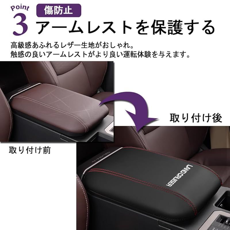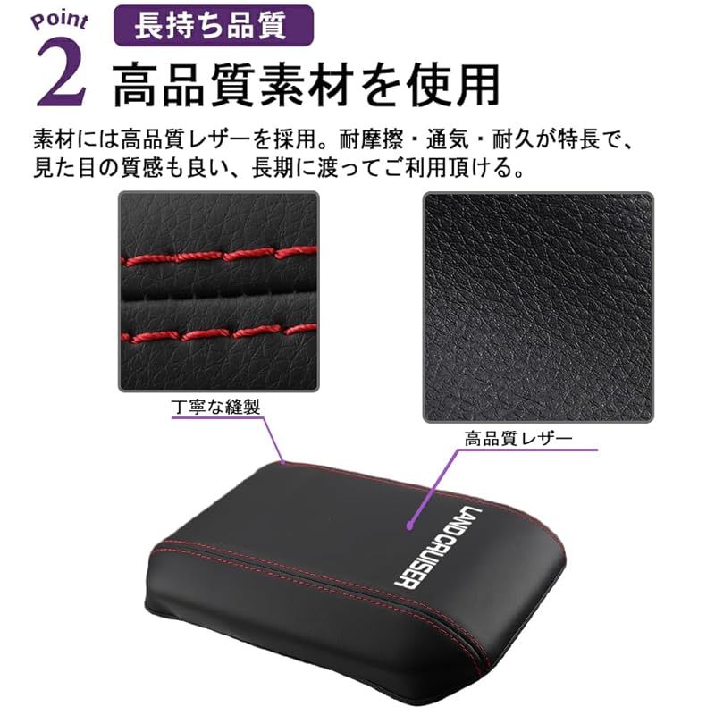 【商品概要】 対応車種:ランドクルーザー 250系。 ※お車と画像をご確認頂いた上、お買い求めくださいませ。 素材良い:素材には高品質レザー採用。耐摩擦・通気性・高耐久が特長で、見た目の質感も良い。丈夫な材質で、長期に渡ってご利用頂ける。 ファッション:レザー生地で、高級感あふれる。精緻な連結技術で、ファッション的な連結、優美な曲線は、車内の色を豊かにする。表面にはロゴが付いています。まるで純正品のように見えます。 お好きなカラー:レッドステッチ、ブラックステッチ、カーボン調、ブラウン。車内の色を豊富したい方にも、車内の色に合わせたい方にも、ぜひお試してください。 取り付け簡単:被せるだけの簡単取付。車種別専用設計なので、コンソールボックスカバーに被せるだけでピッタリフィット。届いたその日にスグ着けられる。