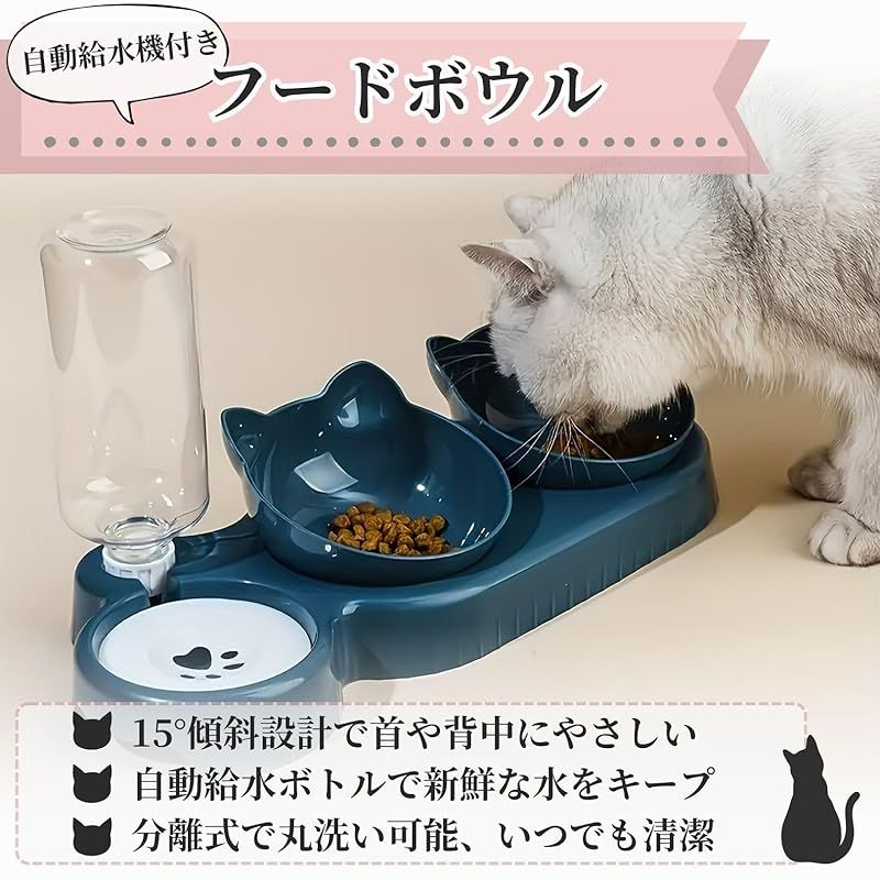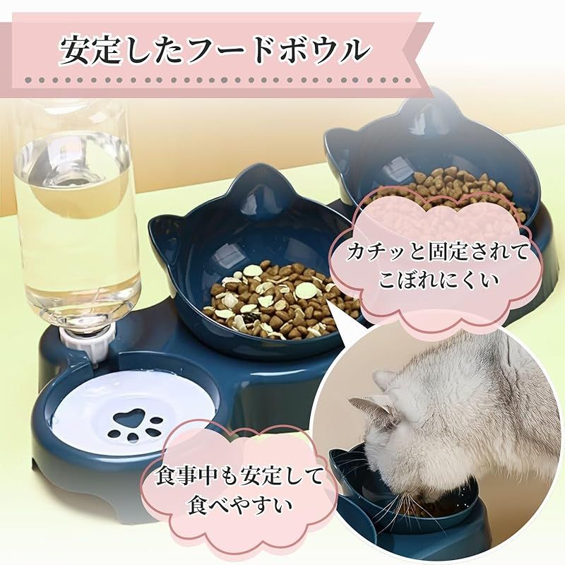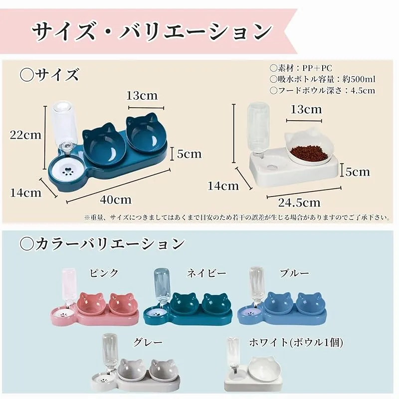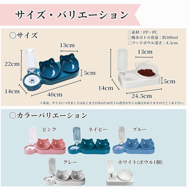【商品仕様】〇バリエーション:給水ボトル+フードボウル2個セット、給水ボトル+フードボウル1個セット。〇フードボウルカラー:フードボウル2個セット→ピンク、ネイビー、ブルー、グレー。フードボウル1個セット→ホワイト。〇サイズ:フードボウル→直径 約13cm×深さ 約4.5cm。台座高さ→約5cm。給水ボトル→約22cm。〇給水ボトル容量:約500ml(約2?3日分の飲料水に対応)。〇素材:PP(ポリプロピレン)、PC(ポリカーボネート)。※重量、サイズにつきましてはあくまで目安のため若干の誤差が生じる場合がありますのでご了承下さい。※商品写真はできる限り実物と近づけるようにしていますが、お使いのモニター設定、お部屋の照明等により実際の商品と色味が異なる場合があります。※海外製品のため日本製のものと比べて細かいところで雑に見えるものや多少の誤差がある場合があります。恐れ入りますが予めご了承ください。