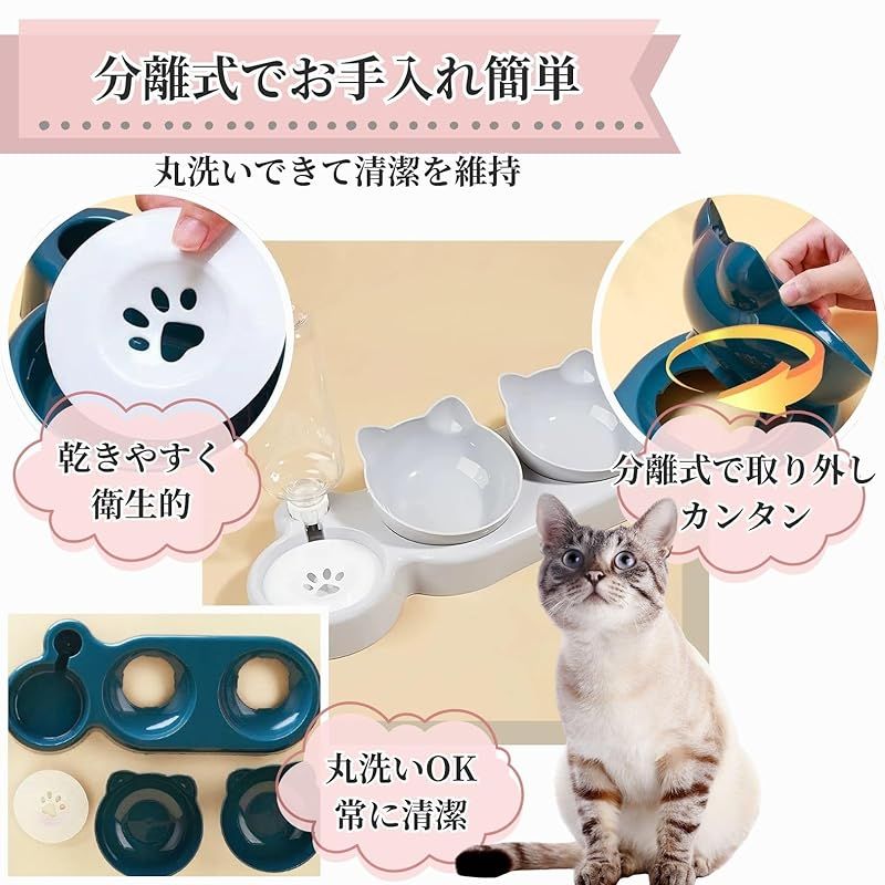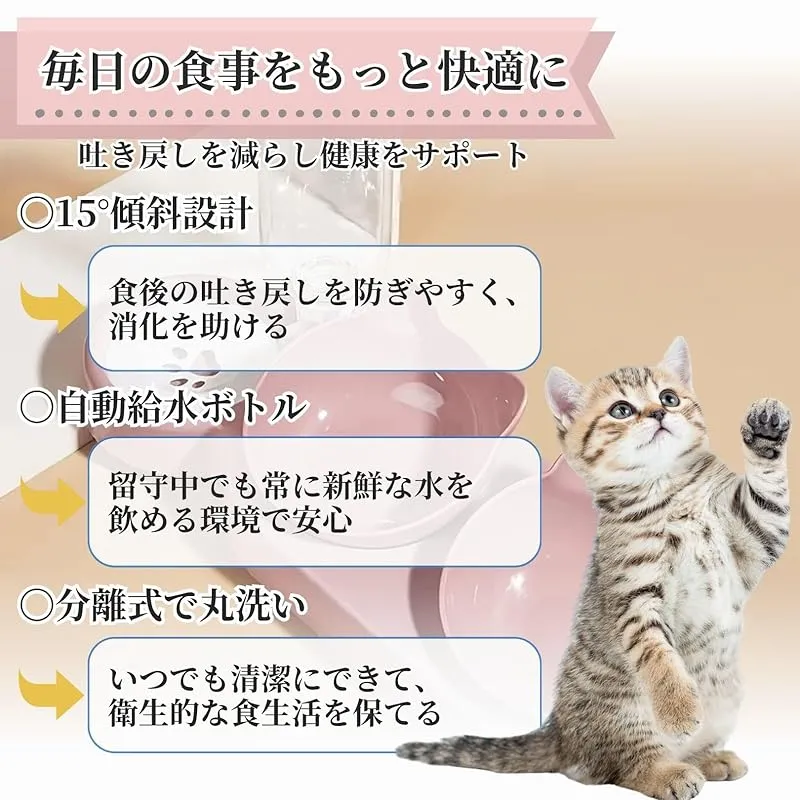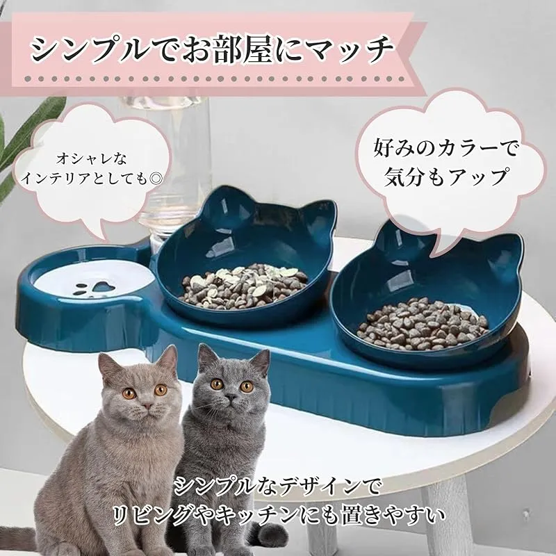 【快適な食事姿勢をサポート】猫用エサボウルは約15度の傾斜設計により、首や背中への負担を和らげる形状です。自然な姿勢で食事ができるため、シニア猫や小型犬もお使いいただけます。台座の高さがあることでフードを食べやすく、飲み込みやすい姿勢や環境を整えます。さらに、傾斜ボウルは食べ残しを減らし食事の効率を高めるため、日々の健康維持にも役立ちます。吐き戻しを防ぎやすく、胃腸に不安のある猫にとっても使える設計となっているフードボウルです。毎日の食事をより自然な姿勢で楽しめます。また、ネコ型のボウルは可愛らしくキュートで、親しみを持ちながら長く愛用できます。